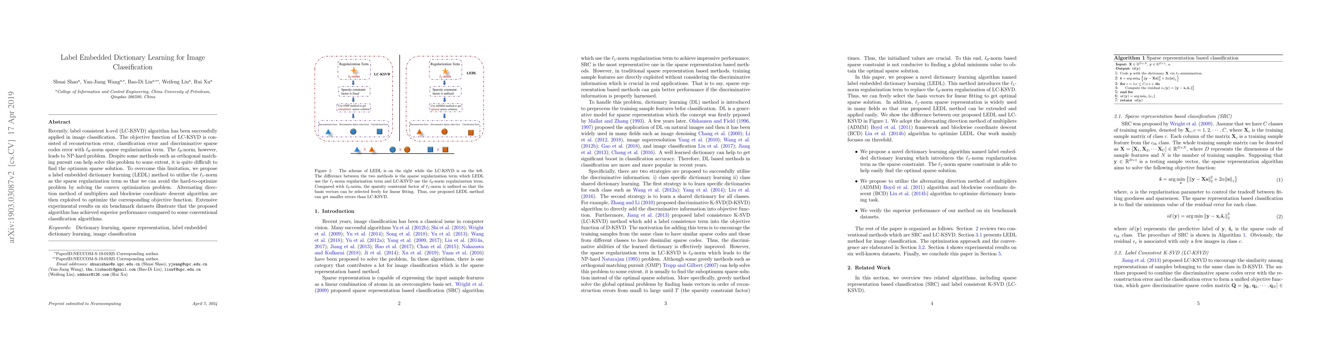 The paper proposes a label embedded dictionary learning (LEDL) method using L1-norm regularization to address the NP-hard problem of L0-norm in LC-KSVD, optimizing via alternating direction method and blockwise coordinate descent. Experimental results show LEDL outperforms conventional classification algorithms on six benchmark datasets.