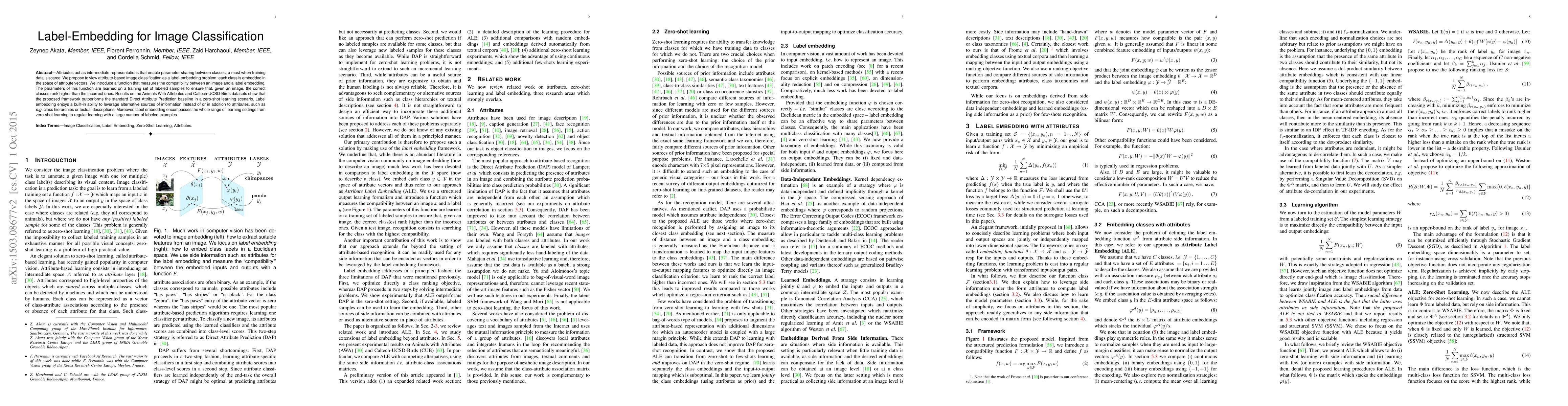 This paper proposes a label-embedding framework for image classification that leverages attributes as intermediate representations to enable parameter sharing across classes, especially useful when training data is limited. The method outperforms standard attribute-based prediction in zero-shot learning scenarios, demonstrating its effectiveness across various learning settings.