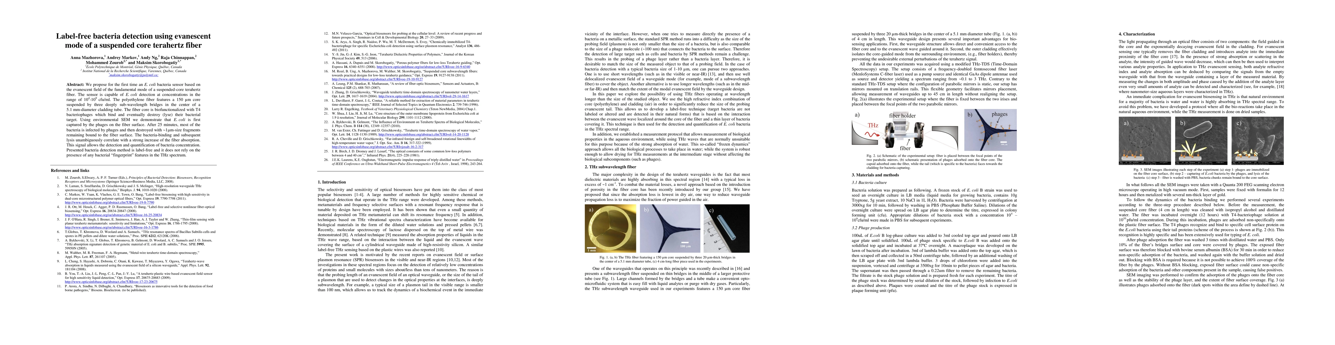 This paper proposes a novel label-free sensor for E. coli bacteria detection using the evanescent field of a suspended-core terahertz fiber. The sensor detects bacteria concentrations ranging from 10⁴ to 10⁹ cfu/ml through the lysis process of T4 bacteriophages bound to the fiber surface.