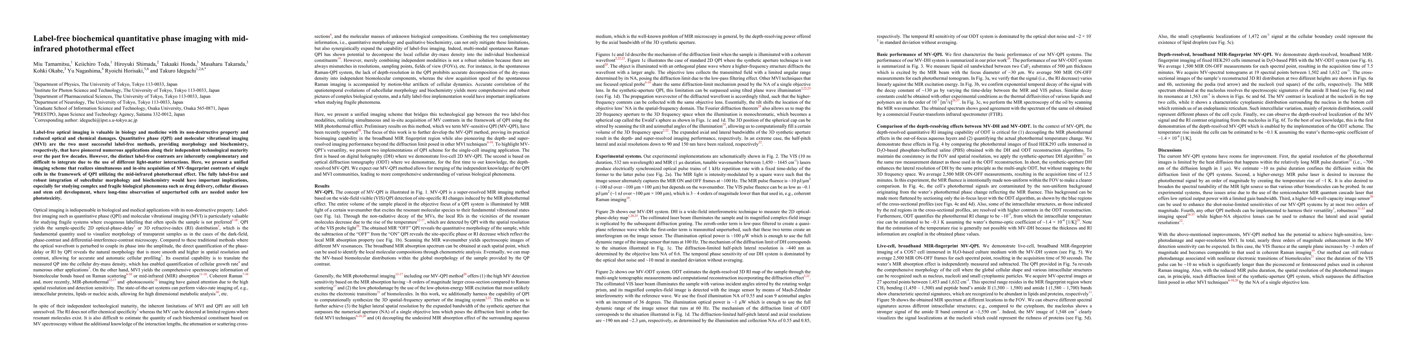 This paper introduces a novel imaging technique combining quantitative phase imaging (QPI) and molecular vibrational imaging (MVI) using mid-infrared photothermal effects, enabling simultaneous label-free observation of cell morphology and biochemistry. This integrated approach facilitates low-phototoxicity, long-term studies of complex biological processes.