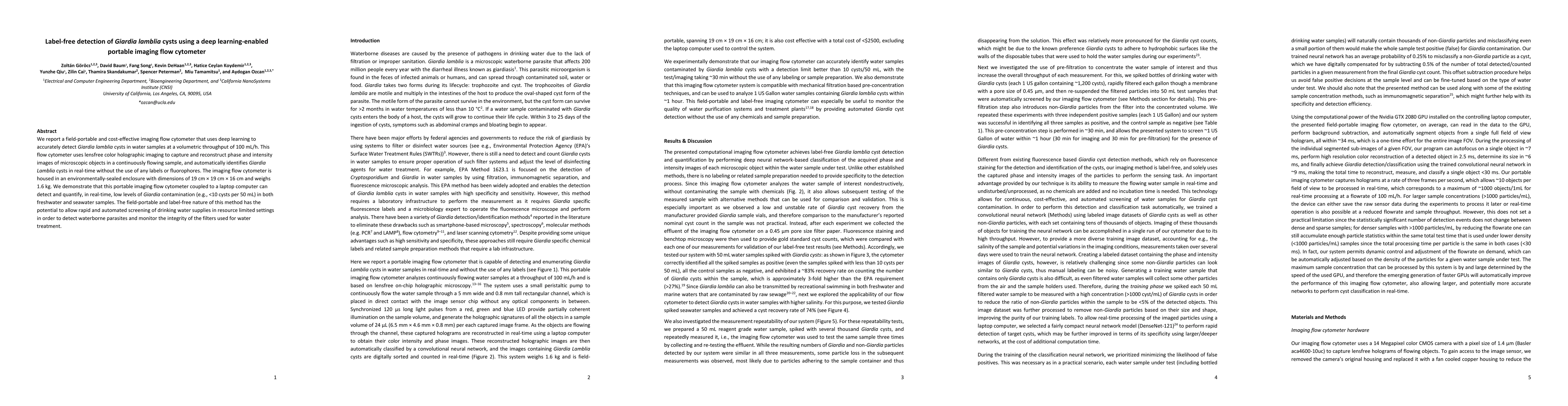 This research presents a portable imaging flow cytometer utilizing deep learning and lensfree holographic imaging to detect Giardia lamblia cysts in water samples without labels, achieving real-time analysis at 100 mL/h throughput. The device's compact size and label-free detection method enable rapid screening of water sources for contamination in resource-limited settings.