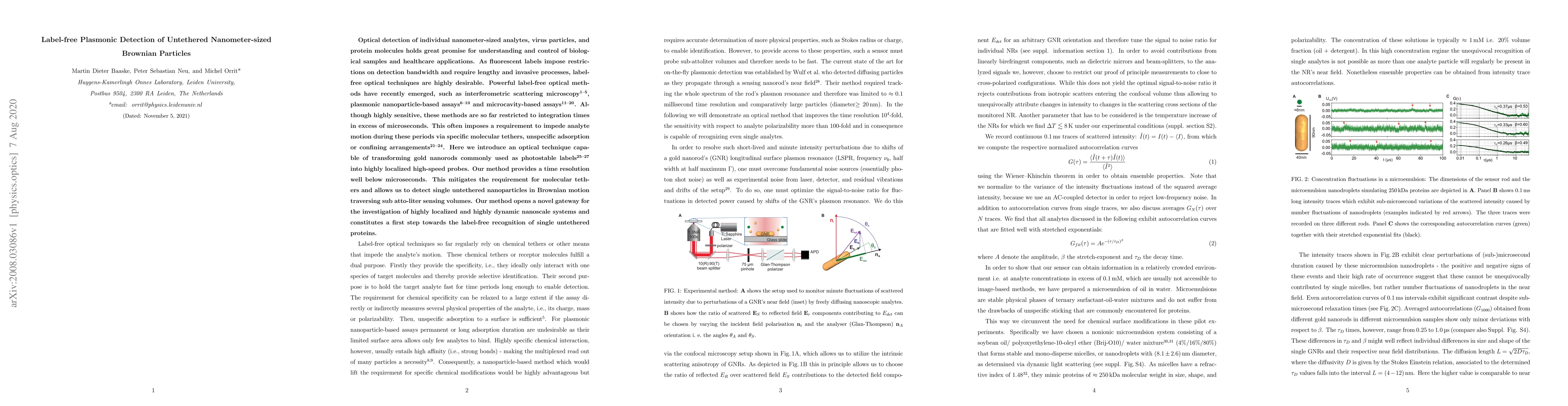 This paper introduces a novel label-free optical technique using gold nanorods to detect untethered nanometer-sized Brownian particles with high time resolution, enabling the observation of single particles in motion without the need for molecular tethers. This method provides a significant advancement for studying dynamic nanoscale systems and protein recognition.