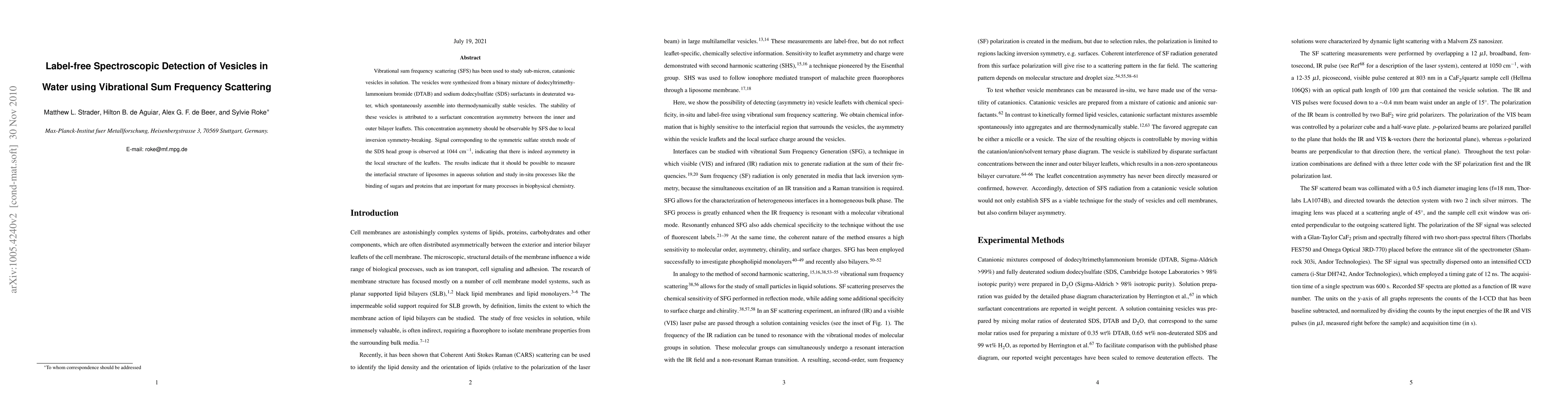 Vibrational sum frequency scattering (SFS) has been used to study sub-micron, catanionic vesicles in solution. The vesicles were synthesized from a binary mixture of dodecyltrimethylammonium bromide (DTAB) and sodium dodecylsulfate (SDS) surfactants in deuterated water, which spontaneously assemble into thermodynamically stable vesicles. The stability of these vesicles is attributed to a surfactant concentration asymmetry between the inner and outer bilayer leaflets. This concentration asymmetry should be observable by SFS due to local inversion symmetry-breaking. Signal corresponding to the symmetric sulfate stretch mode of the SDS head group is observed at 1044 cm, indicating that there is indeed asymmetry in the local structure of the leaflets. The results indicate that it should be possible to measure the interfacial structure of liposomes in aqueous solution and study in-situ processes like the binding of sugars and proteins that are important for many processes in biophysical chemistry.