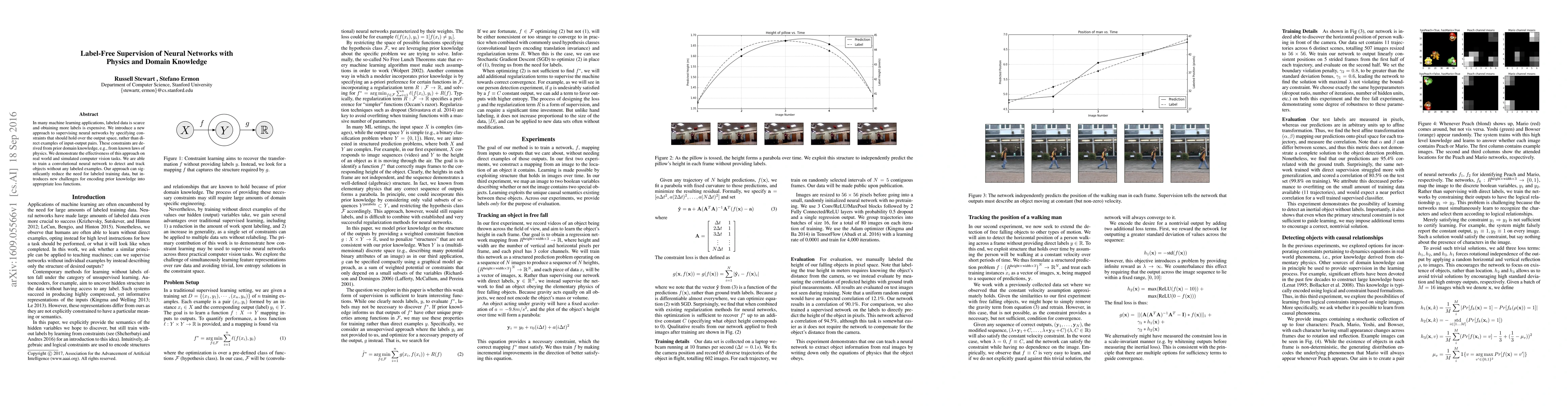 This paper proposes a method for training neural networks using constraints derived from domain knowledge, such as physical laws, instead of labeled data. The approach successfully trains a convolutional neural network for object detection and tracking without any labeled examples, significantly reducing the need for labeled data.