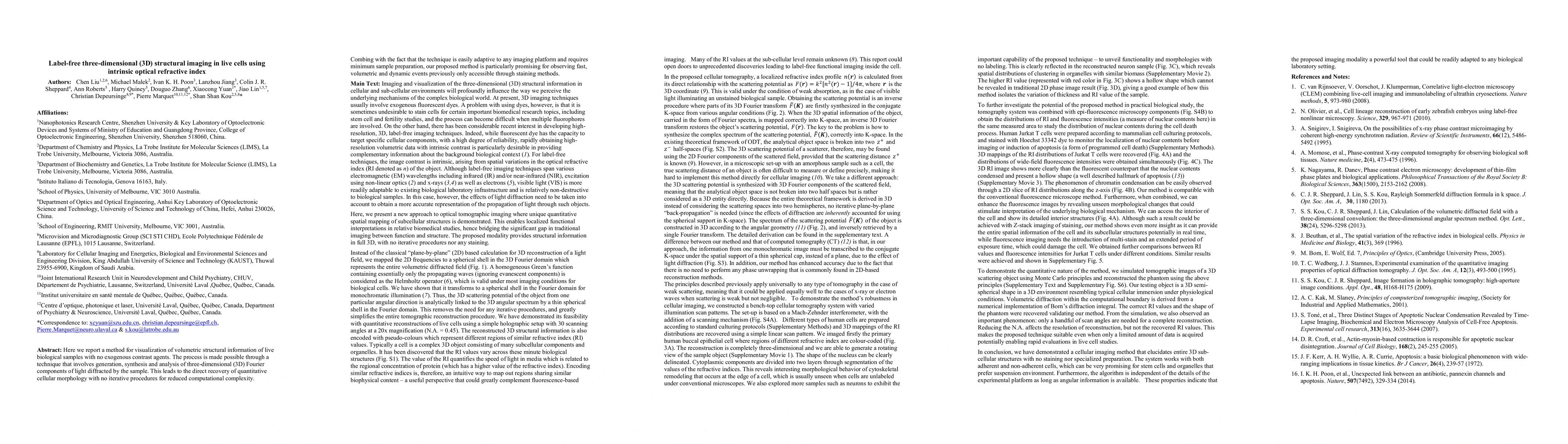 This paper introduces a novel label-free 3D imaging technique for live cells based on intrinsic optical refractive index, utilizing 3D Fourier analysis of diffracted light to visualize volumetric structural information without the need for contrast agents or staining. The method offers direct recovery of cellular morphology with minimal computational complexity and is adaptable to various imaging platforms.