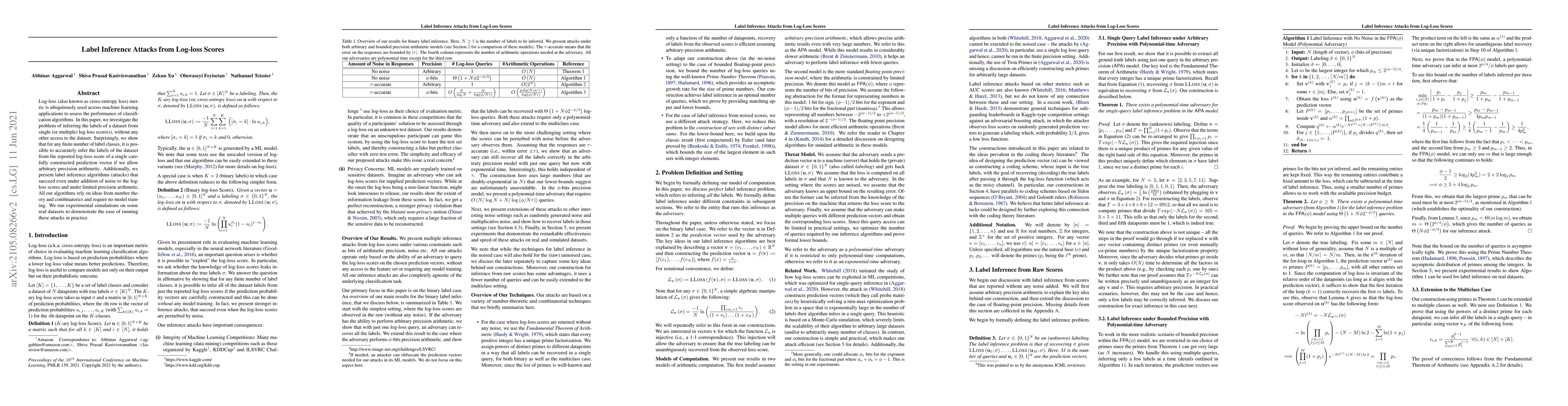 This paper explores label inference attacks using log-loss scores, demonstrating that it's possible to accurately deduce dataset labels from these scores without direct access to the data. The authors propose algorithms that succeed even with noise and limited precision, relying on number theory and combinatorics, and validate their methods through experiments on real datasets.