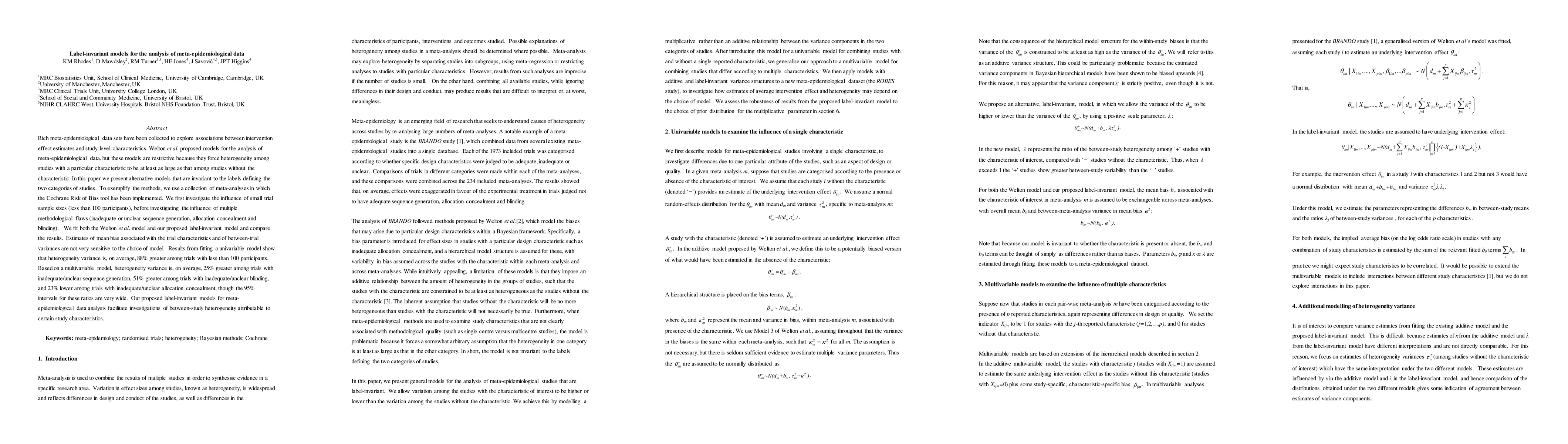 This paper introduces label-invariant models for analyzing meta-epidemiological data, offering a more flexible alternative to existing models. The study finds that heterogeneity variances are significantly higher for trials with small sample sizes and certain methodological flaws, though results vary widely.
