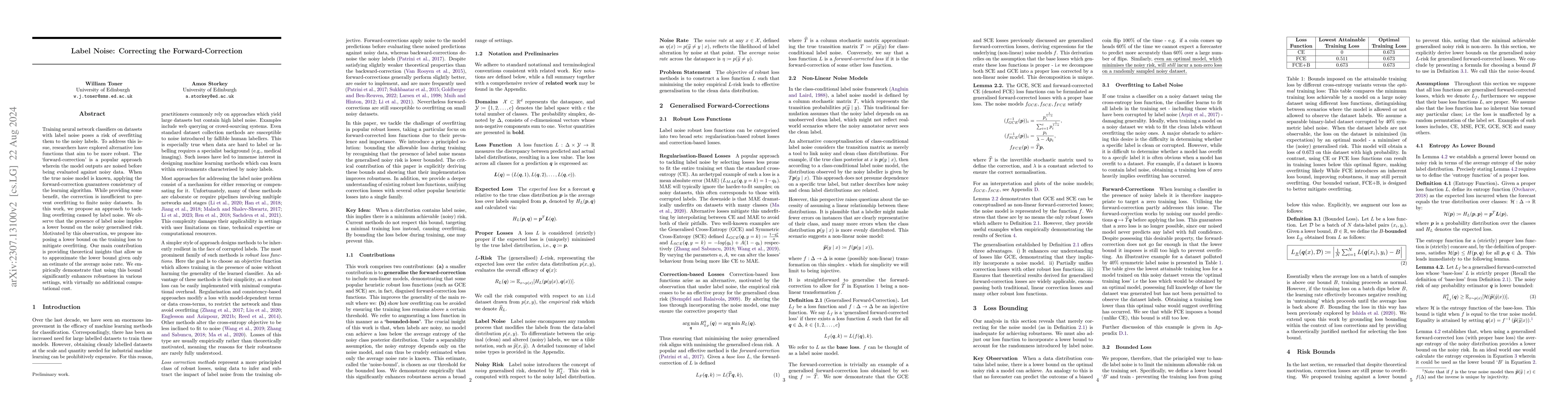 Training neural network classifiers on datasets with label noise poses a risk of overfitting them to the noisy labels. To address this issue, researchers have explored alternative loss functions that aim to be more robust. However, many of these alternatives are heuristic in nature and still vulnerable to overfitting or underfitting. In this work, we propose a more direct approach to tackling overfitting caused by label noise. We observe that the presence of label noise implies a lower bound on the noisy generalised risk. Building upon this observation, we propose imposing a lower bound on the empirical risk during training to mitigate overfitting. Our main contribution is providing theoretical results that yield explicit, easily computable bounds on the minimum achievable noisy risk for different loss functions. We empirically demonstrate that using these bounds significantly enhances robustness in various settings, with virtually no additional computational cost.