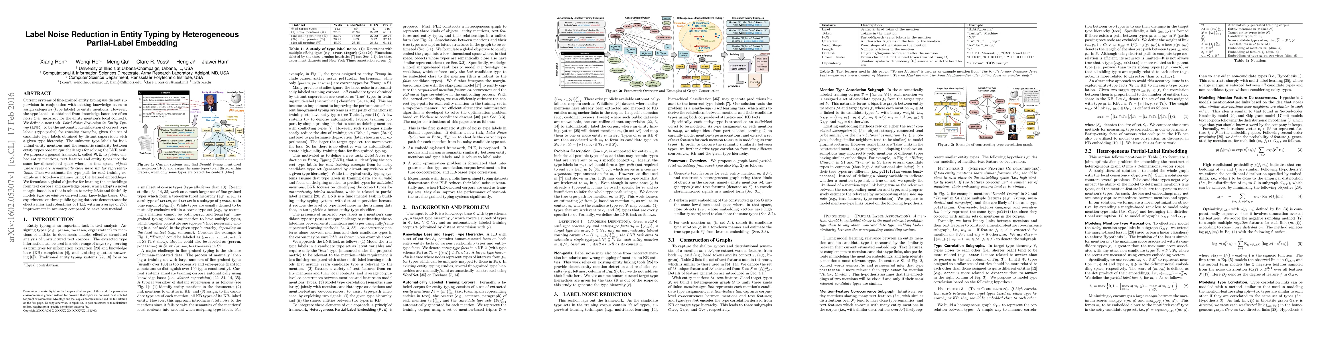 Current systems of fine-grained entity typing use distant supervision in conjunction with existing knowledge bases to assign categories (type labels) to entity mentions. However, the type labels so obtained from knowledge bases are often noisy (i.e., incorrect for the entity mention's local context). We define a new task, Label Noise Reduction in Entity Typing (LNR), to be the automatic identification of correct type labels (type-paths) for training examples, given the set of candidate type labels obtained by distant supervision with a given type hierarchy. The unknown type labels for individual entity mentions and the semantic similarity between entity types pose unique challenges for solving the LNR task. We propose a general framework, called PLE, to jointly embed entity mentions, text features and entity types into the same low-dimensional space where, in that space, objects whose types are semantically close have similar representations. Then we estimate the type-path for each training example in a top-down manner using the learned embeddings. We formulate a global objective for learning the embeddings from text corpora and knowledge bases, which adopts a novel margin-based loss that is robust to noisy labels and faithfully models type correlation derived from knowledge bases. Our experiments on three public typing datasets demonstrate the effectiveness and robustness of PLE, with an average of 25% improvement in accuracy compared to next best method.