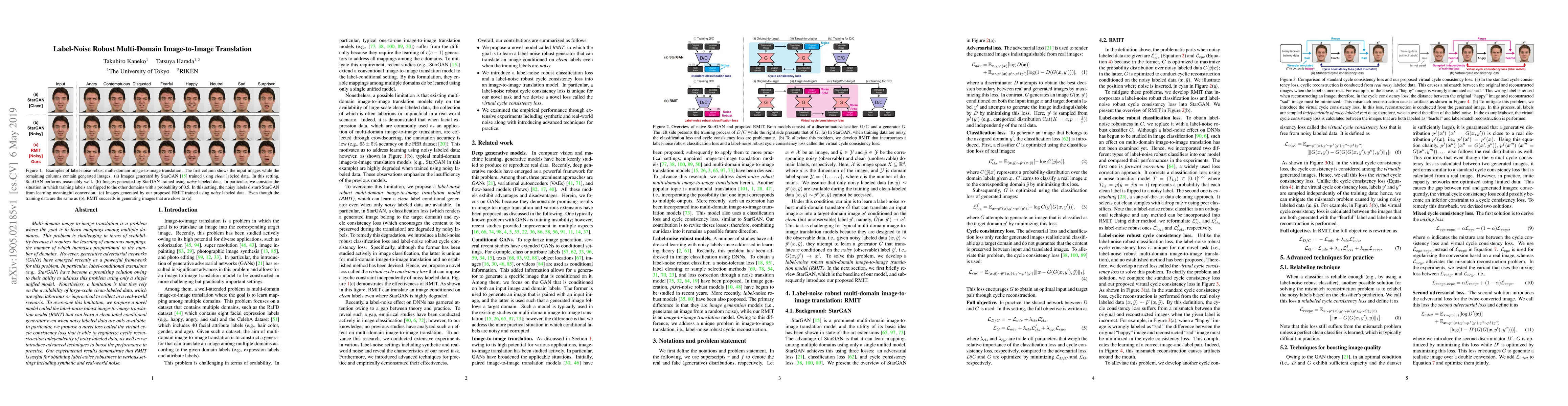 This paper proposes a novel label-noise robust image-to-image translation model (RMIT) to address the challenge of multi-domain translation using noisy labeled data. It introduces a virtual cycle consistency loss to enhance cyclic reconstruction without relying on clean labels, demonstrating improved performance in real-world scenarios.