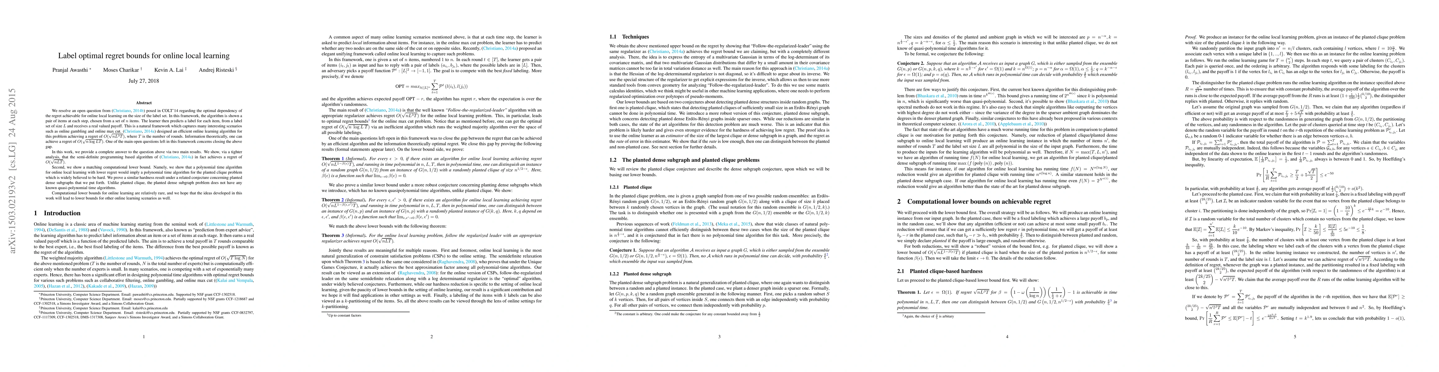 We resolve an open question from (Christiano, 2014b) posed in COLT'14 regarding the optimal dependency of the regret achievable for online local learning on the size of the label set. In this framework the algorithm is shown a pair of items at each step, chosen from a set of $n$ items. The learner then predicts a label for each item, from a label set of size $L$ and receives a real valued payoff. This is a natural framework which captures many interesting scenarios such as collaborative filtering, online gambling, and online max cut among others. (Christiano, 2014a) designed an efficient online learning algorithm for this problem achieving a regret of $O(\sqrt{nL^3T})$, where $T$ is the number of rounds. Information theoretically, one can achieve a regret of $O(\sqrt{n \log L T})$. One of the main open questions left in this framework concerns closing the above gap. In this work, we provide a complete answer to the question above via two main results. We show, via a tighter analysis, that the semi-definite programming based algorithm of (Christiano, 2014a), in fact achieves a regret of $O(\sqrt{nLT})$. Second, we show a matching computational lower bound. Namely, we show that a polynomial time algorithm for online local learning with lower regret would imply a polynomial time algorithm for the planted clique problem which is widely believed to be hard. We prove a similar hardness result under a related conjecture concerning planted dense subgraphs that we put forth. Unlike planted clique, the planted dense subgraph problem does not have any known quasi-polynomial time algorithms. Computational lower bounds for online learning are relatively rare, and we hope that the ideas developed in this work will lead to lower bounds for other online learning scenarios as well.