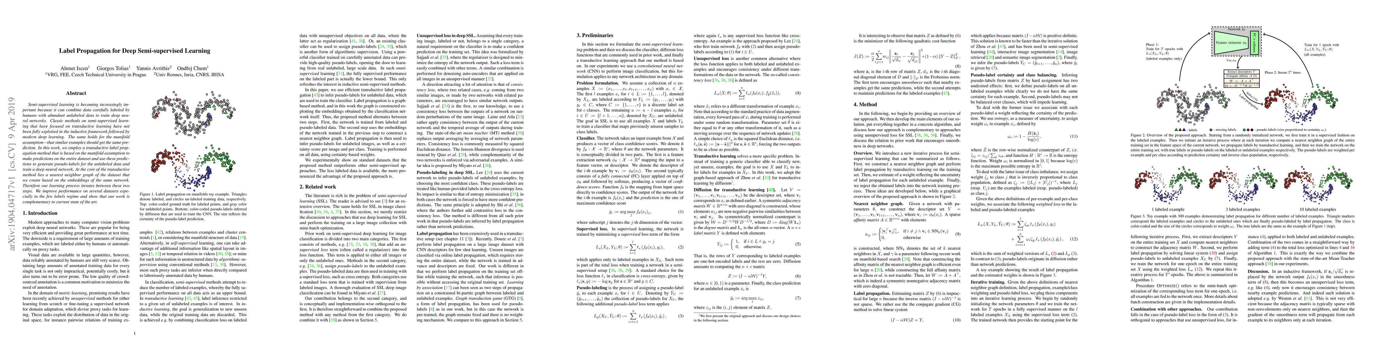 This paper proposes a transductive label propagation method for deep semi-supervised learning that leverages the manifold assumption to generate pseudo-labels for unlabeled data. The method iteratively refines predictions using a nearest neighbor graph based on network embeddings, improving performance on several datasets, especially when few labels are available.