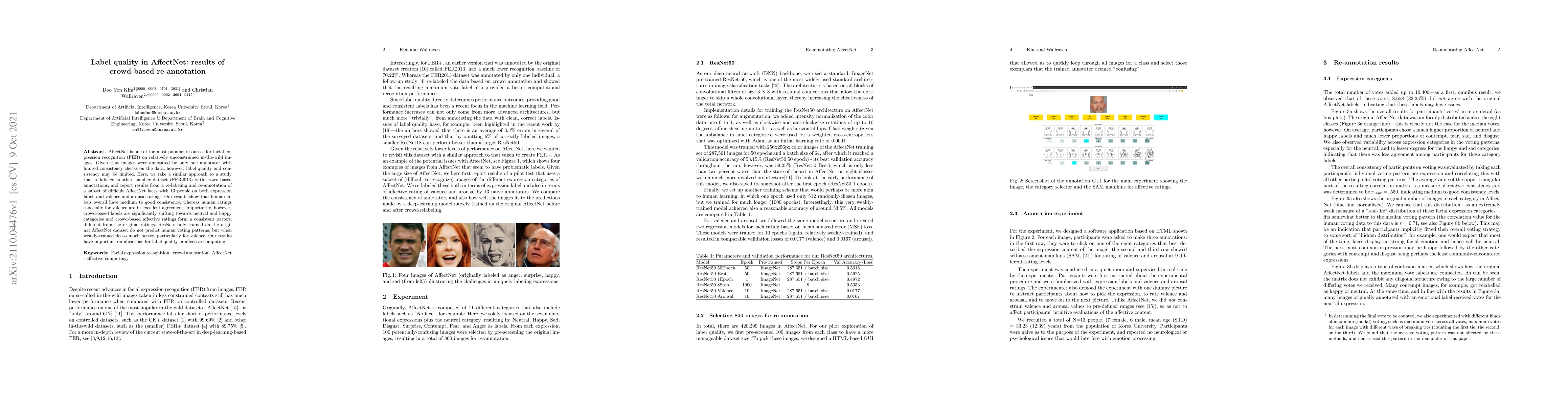AffectNet is one of the most popular resources for facial expression recognition (FER) on relatively unconstrained in-the-wild images. Given that images were annotated by only one annotator with limited consistency checks on the data, however, label quality and consistency may be limited. Here, we take a similar approach to a study that re-labeled another, smaller dataset (FER2013) with crowd-based annotations, and report results from a re-labeling and re-annotation of a subset of difficult AffectNet faces with 13 people on both expression label, and valence and arousal ratings. Our results show that human labels overall have medium to good consistency, whereas human ratings especially for valence are in excellent agreement. Importantly, however, crowd-based labels are significantly shifting towards neutral and happy categories and crowd-based affective ratings form a consistent pattern different from the original ratings. ResNets fully trained on the original AffectNet dataset do not predict human voting patterns, but when weakly-trained do so much better, particularly for valence. Our results have important ramifications for label quality in affective computing.