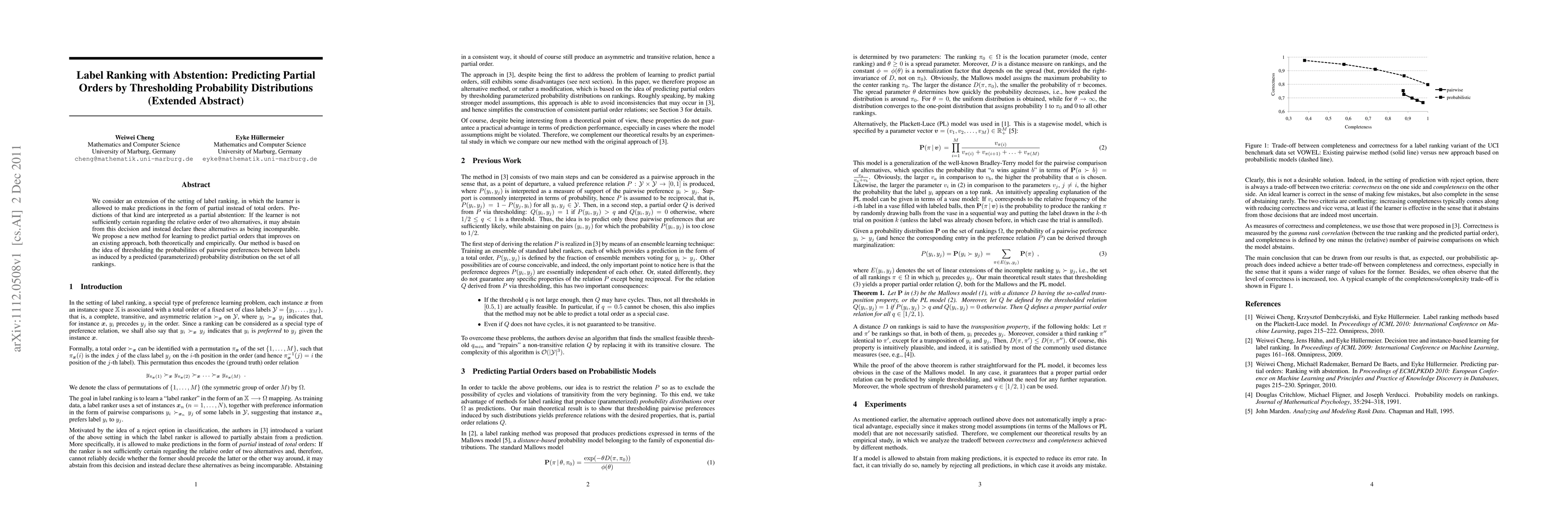 This paper proposes a new method for label ranking that allows predictions to be partial orders, enabling abstention when the model is uncertain about the relative order of alternatives. The method improves existing approaches by using thresholding on probabilities of pairwise preferences derived from a predicted probability distribution over all possible rankings.