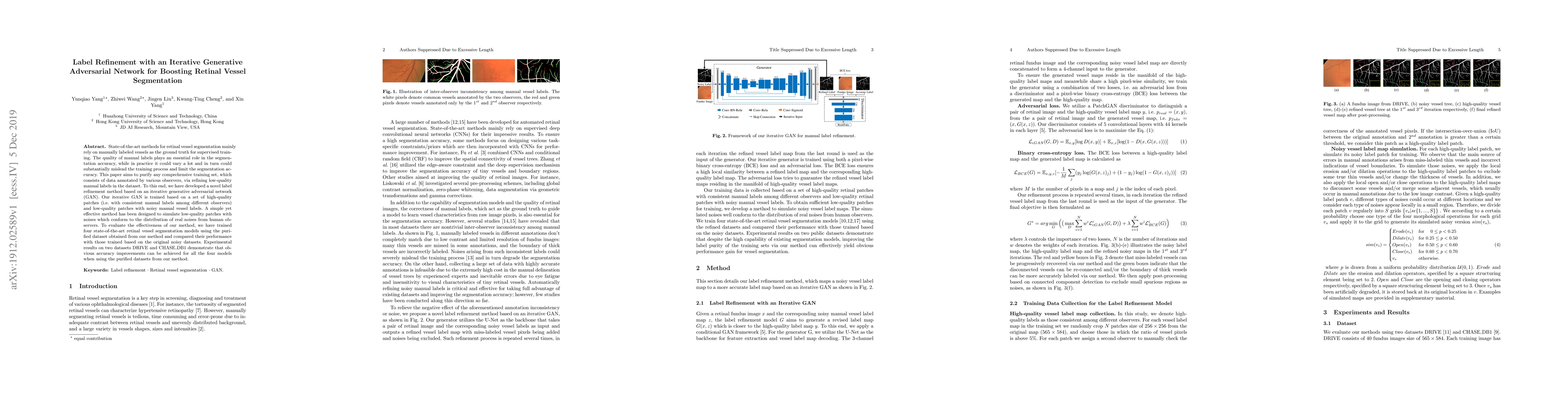 This paper proposes a label refinement method using an iterative generative adversarial network (GAN) to improve retinal vessel segmentation by purifying datasets with inconsistent manual labels. Experimental results on two datasets show significant accuracy improvements for state-of-the-art segmentation models trained on the refined datasets.