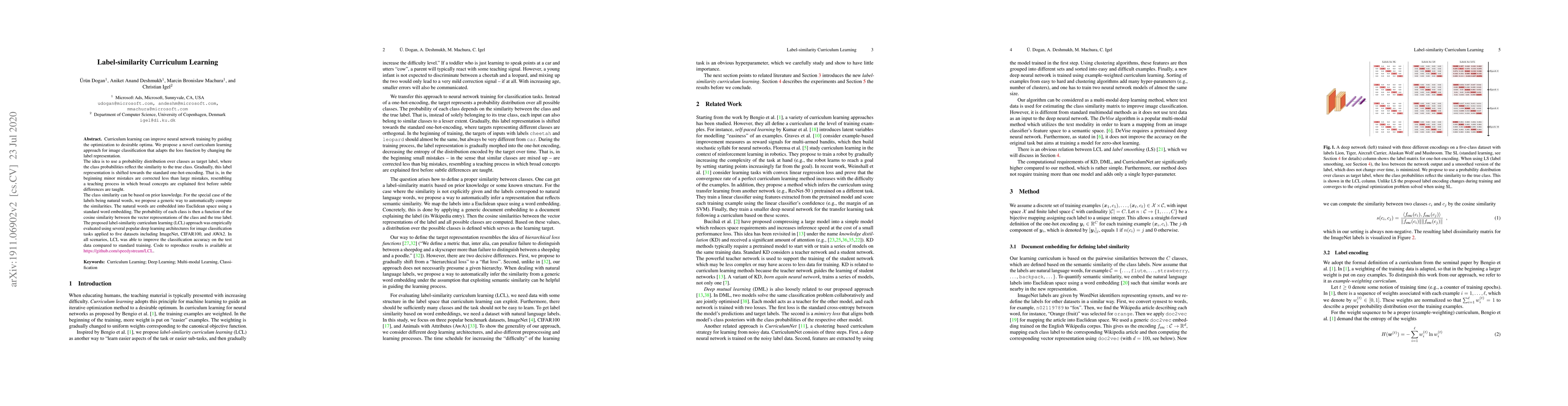 The paper proposes label-similarity curriculum learning (LCL) to improve neural network training by gradually shifting the label representation from a probability distribution reflecting class similarity to standard one-hot encoding, leading to better classification accuracy on various datasets. LCL computes class similarity using word embeddings for natural language labels and was shown to outperform standard training methods.