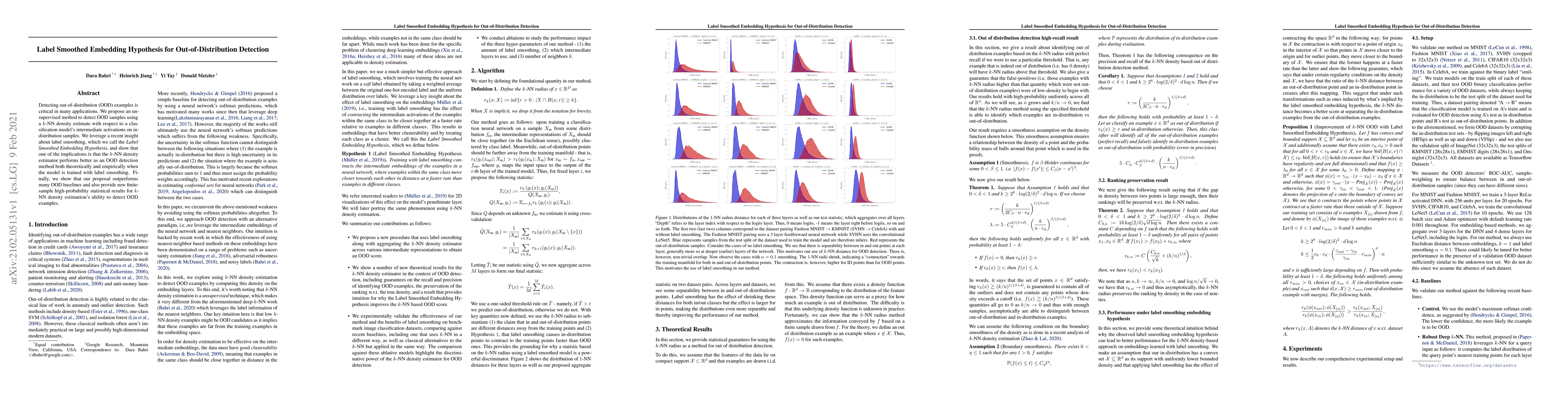 Detecting out-of-distribution (OOD) examples is critical in many applications. We propose an unsupervised method to detect OOD samples using a $k$-NN density estimate with respect to a classification model's intermediate activations on in-distribution samples. We leverage a recent insight about label smoothing, which we call the \emph{Label Smoothed Embedding Hypothesis}, and show that one of the implications is that the $k$-NN density estimator performs better as an OOD detection method both theoretically and empirically when the model is trained with label smoothing. Finally, we show that our proposal outperforms many OOD baselines and also provide new finite-sample high-probability statistical results for $k$-NN density estimation's ability to detect OOD examples.