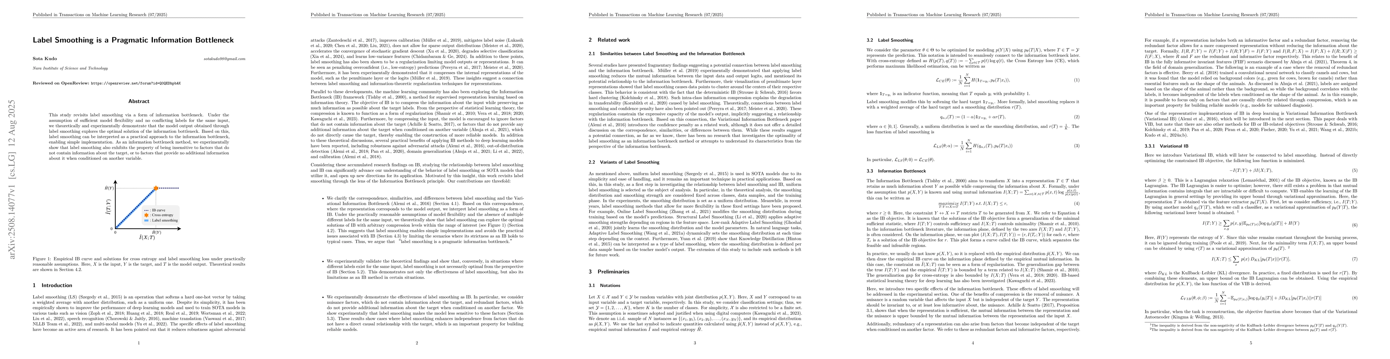 This study revisits label smoothing via a form of information bottleneck. Under the assumption of sufficient model flexibility and no conflicting labels for the same input, we theoretically and experimentally demonstrate that the model output obtained through label smoothing explores the optimal solution of the information bottleneck. Based on this, label smoothing can be interpreted as a practical approach to the information bottleneck, enabling simple implementation. As an information bottleneck method, we experimentally show that label smoothing also exhibits the property of being insensitive to factors that do not contain information about the target, or to factors that provide no additional information about it when conditioned on another variable.