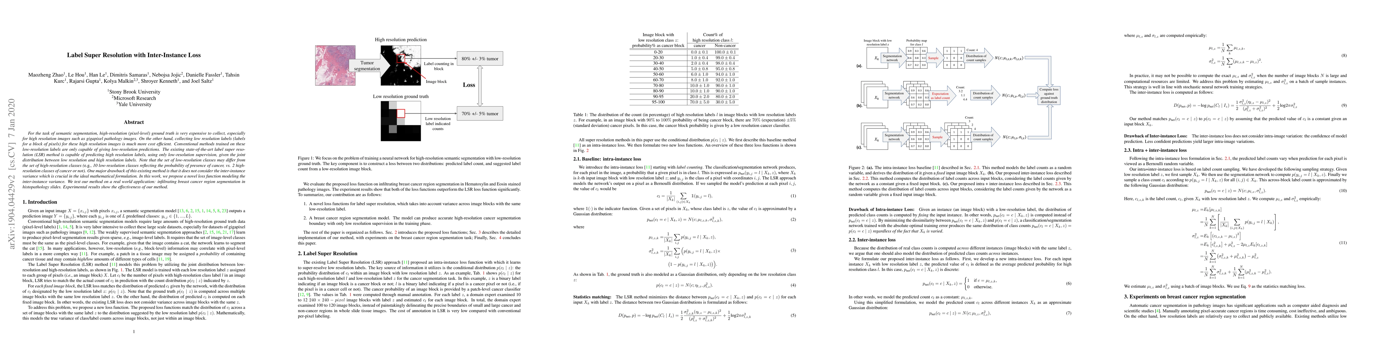 For the task of semantic segmentation, high-resolution (pixel-level) ground truth is very expensive to collect, especially for high resolution images such as gigapixel pathology images. On the other hand, collecting low resolution labels (labels for a block of pixels) for these high resolution images is much more cost efficient. Conventional methods trained on these low-resolution labels are only capable of giving low-resolution predictions. The existing state-of-the-art label super resolution (LSR) method is capable of predicting high resolution labels, using only low-resolution supervision, given the joint distribution between low resolution and high resolution labels. However, it does not consider the inter-instance variance which is crucial in the ideal mathematical formulation. In this work, we propose a novel loss function modeling the inter-instance variance. We test our method on a real world application: infiltrating breast cancer region segmentation in histopathology slides. Experimental results show the effectiveness of our method.