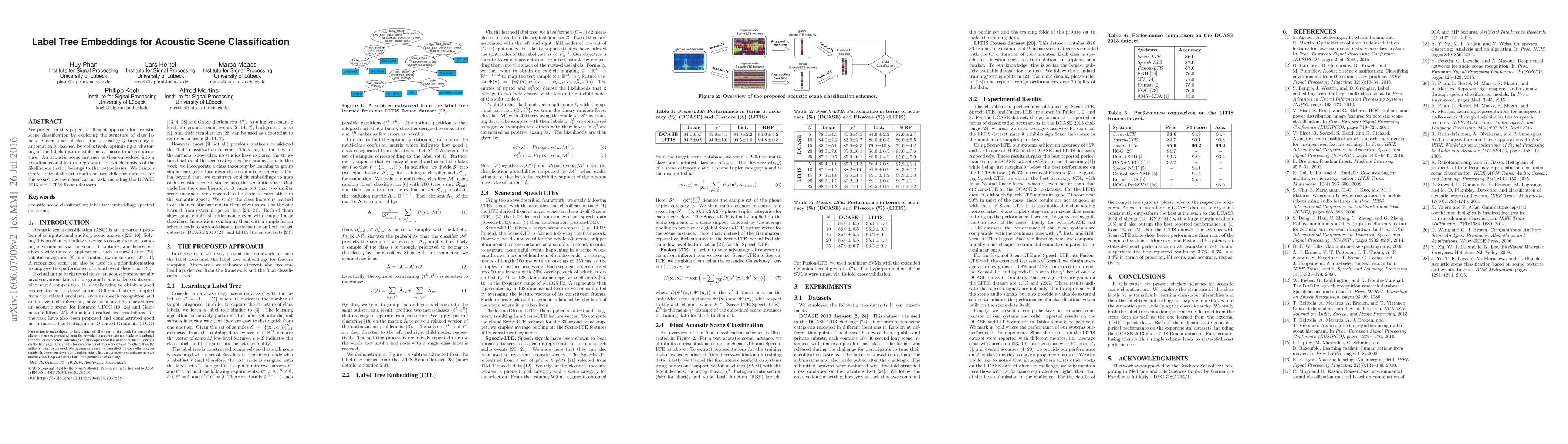 This paper proposes an efficient method for acoustic scene classification using label tree embeddings, which automatically learns a category taxonomy from class labels and embeds scenes into low-dimensional features based on their likelihood of belonging to meta-classes. The approach achieves state-of-the-art results on DCASE 2013 and LITIS Rouen datasets.