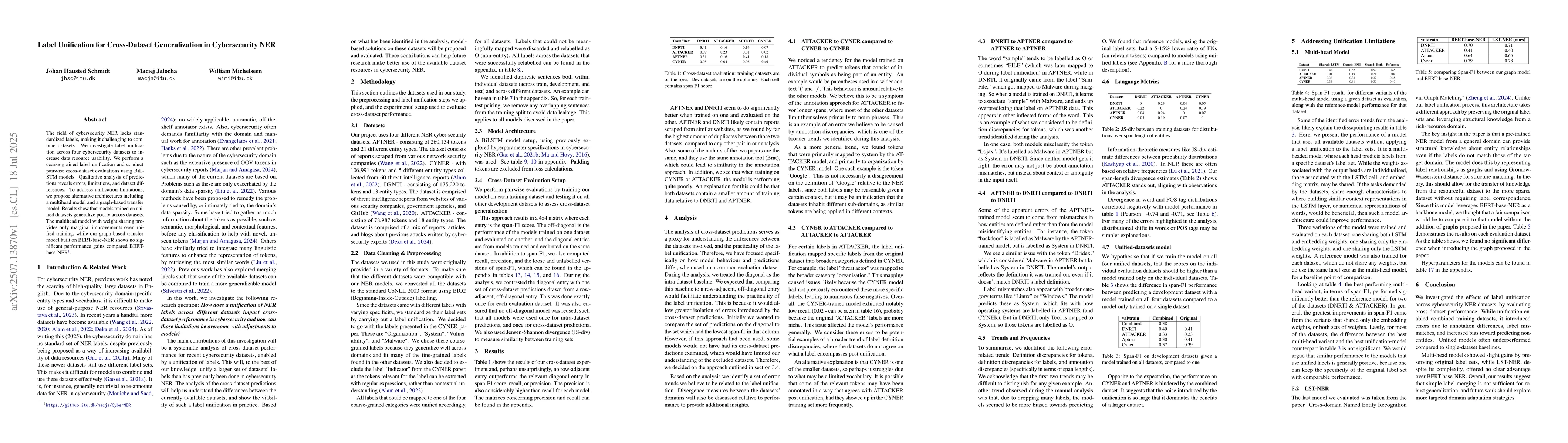 This research explores label unification in cybersecurity Named Entity Recognition (NER) to improve data resource usability across four datasets. Despite efforts with BiLSTM models, multihead models, and graph-based transfer models, generalization across datasets remains poor, with only marginal improvements seen in certain cases.