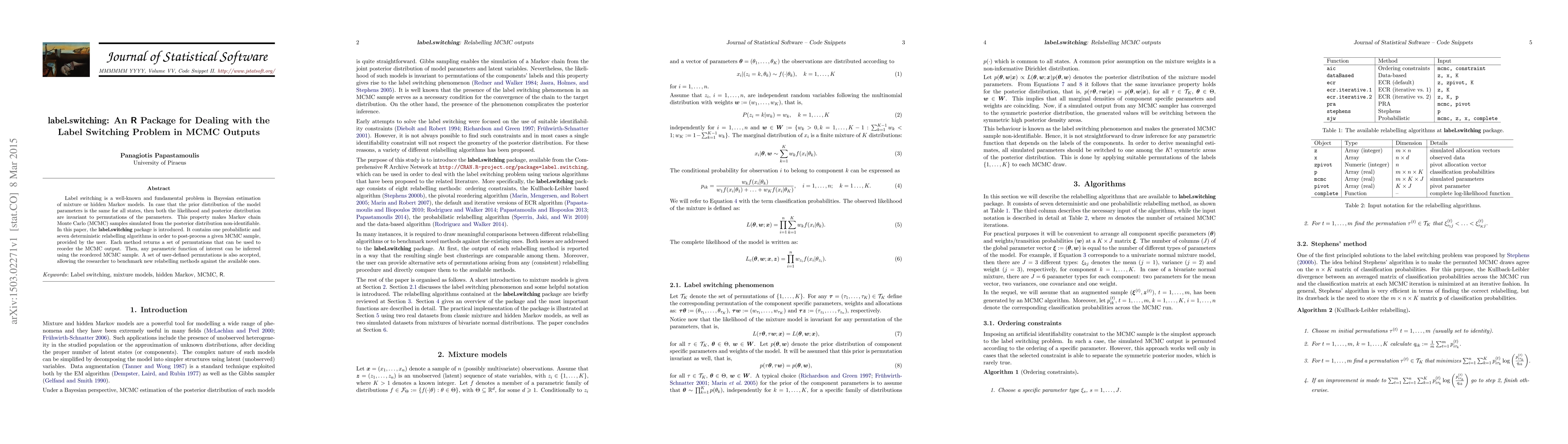 Label switching is a well-known and fundamental problem in Bayesian estimation of mixture or hidden Markov models. In case that the prior distribution of the model parameters is the same for all states, then both the likelihood and posterior distribution are invariant to permutations of the parameters. This property makes Markov chain Monte Carlo (MCMC) samples simulated from the posterior distribution non-identifiable. In this paper, the \pkg{label.switching} package is introduced. It contains one probabilistic and seven deterministic relabelling algorithms in order to post-process a given MCMC sample, provided by the user. Each method returns a set of permutations that can be used to reorder the MCMC output. Then, any parametric function of interest can be inferred using the reordered MCMC sample. A set of user-defined permutations is also accepted, allowing the researcher to benchmark new relabelling methods against the available ones