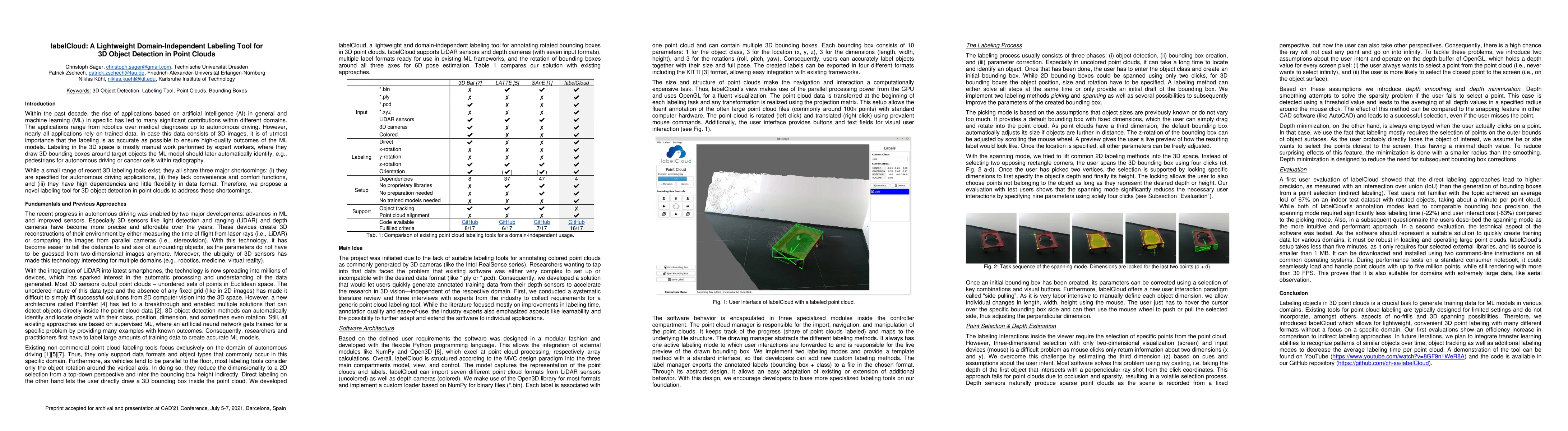 **Summary:** The paper introduces labelCloud, a lightweight, domain-independent labeling tool designed to facilitate 3D object detection in point clouds, addressing the limitations of existing tools by offering flexibility, convenience, and broad applicability across various AI applications.