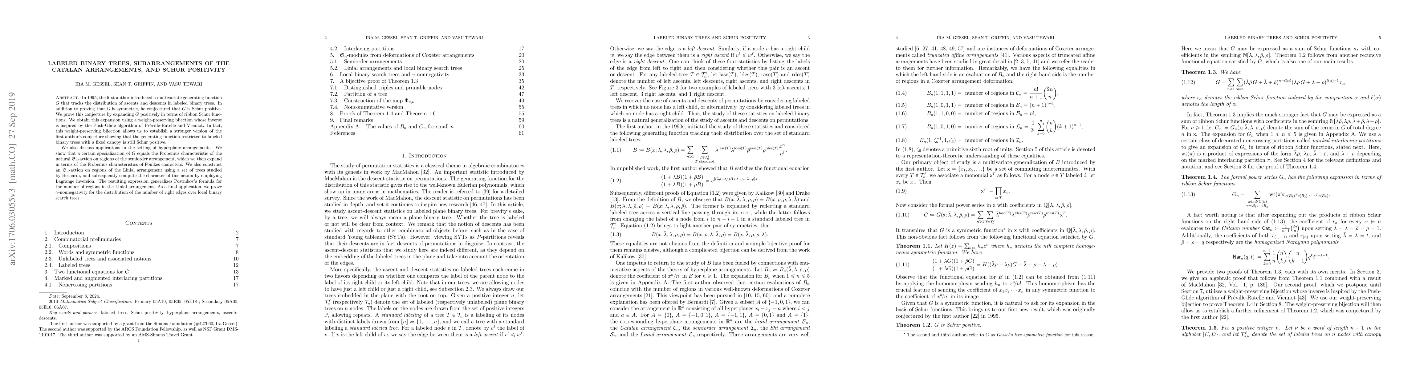 This paper proves the Schur positivity conjecture for a multivariate generating function tracking ascents and descents in labeled binary trees, using a weight-preserving bijection inspired by the Push-Glide algorithm. It also extends the conjecture to trees with fixed canopy and applies the results to hyperplane arrangements and local binary search trees.