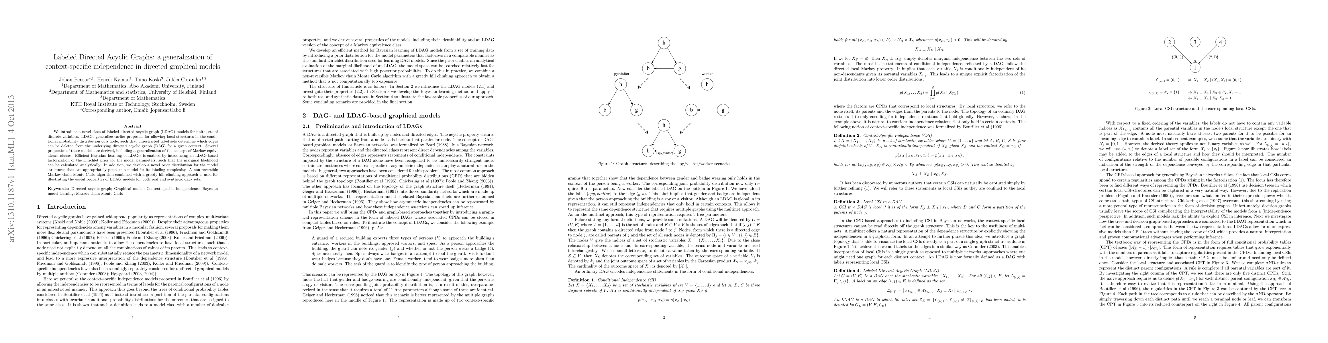 This paper introduces labeled directed acyclic graph (LDAG) models to generalize context-specific independence in directed graphical models, enabling local structures in conditional probability distributions. It also presents efficient Bayesian learning methods and a non-reversible MCMC algorithm for model inference.