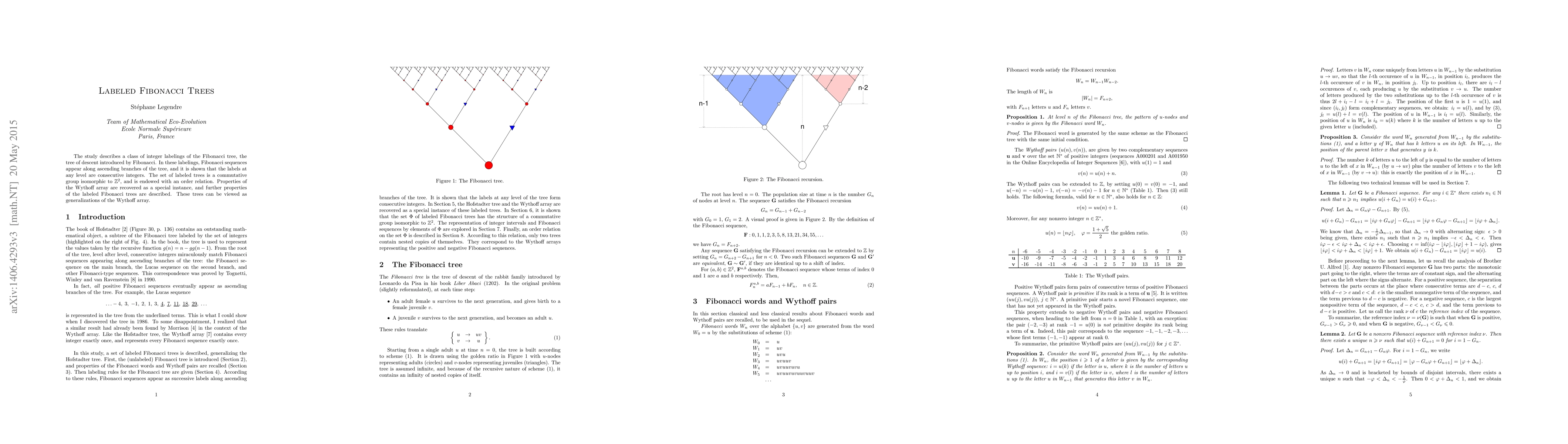 The study describes a class of integer labelings of the Fibonacci tree, the tree of descent introduced by Fibonacci. In these labelings, Fibonacci sequences appear along ascending branches of the tree, and it is shown that the labels at any level are consecutive integers. The set of labeled trees is a commutative group isomorphic to $\mathbb{Z}^2$, and is endowed with an order relation. Properties of the Wythoff array are recovered as a special instance, and further properties of the labeled Fibonacci trees are described. These trees can be viewed as generalizations of the Wythoff array.