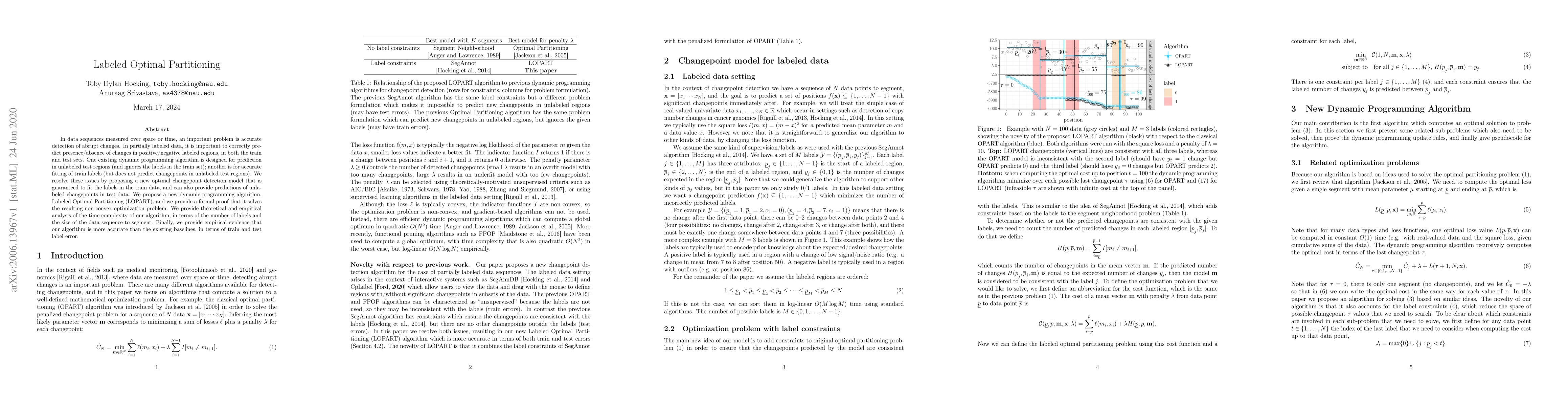 The paper proposes a new optimal changepoint detection model called Labeled Optimal Partitioning (LOPART) that fits train labels and predicts unlabeled changepoints in test data, providing a dynamic programming algorithm with a proven solution to the non-convex optimization problem. Empirical results show LOPART outperforms existing baselines in label error accuracy.