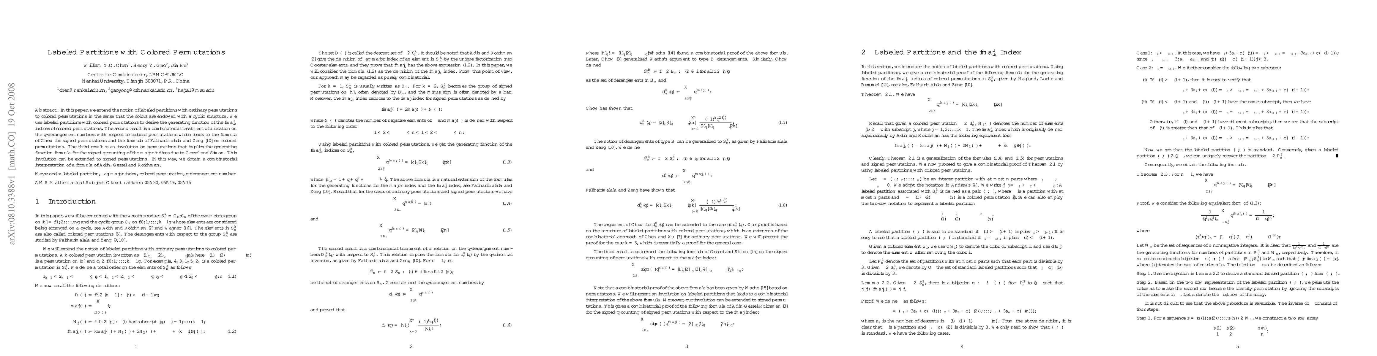 This paper explores labeled partitions with colored permutations, establishing a generating function for $\mathrm{fmaj}_k$ indices and a combinatorial relation on q-derangement numbers. It also introduces an involution that connects to the signed q-counting of major indices, providing a combinatorial interpretation for a formula by Adin, Gessel, and Roichman.