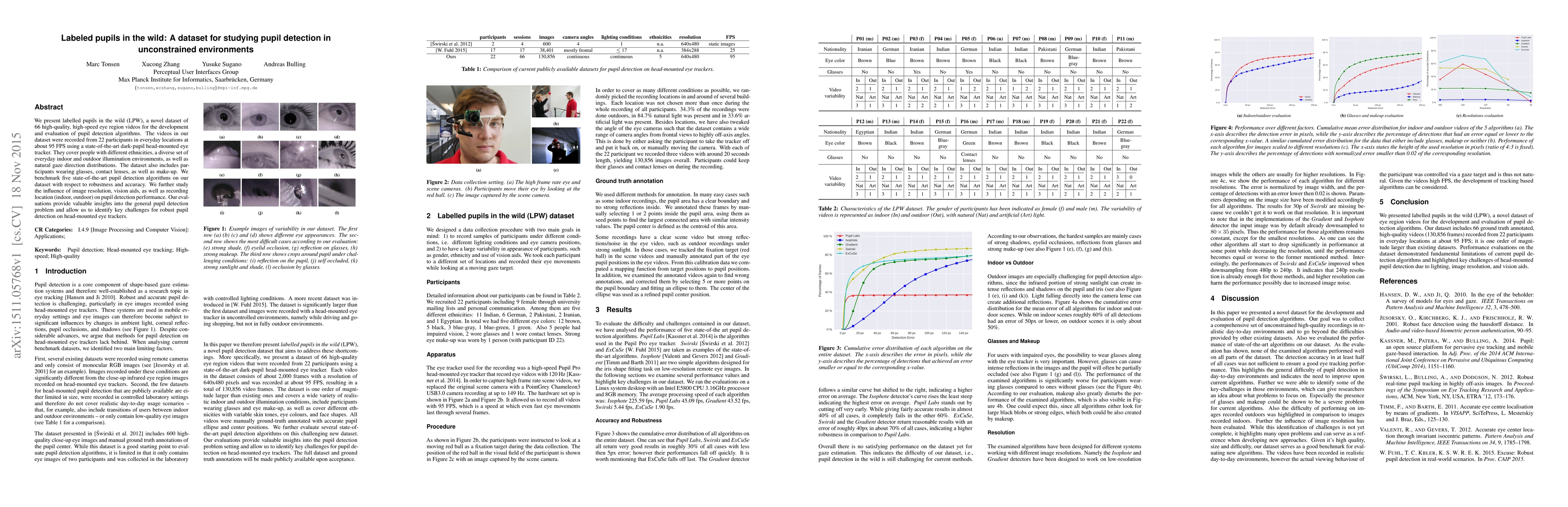 This paper introduces the Labeled Pupils in the Wild (LPW) dataset, comprising high-speed eye region videos from diverse environments to advance pupil detection research. The study benchmarks five algorithms on the dataset, analyzing factors like resolution, vision aids, and recording locations to identify challenges in robust pupil detection.