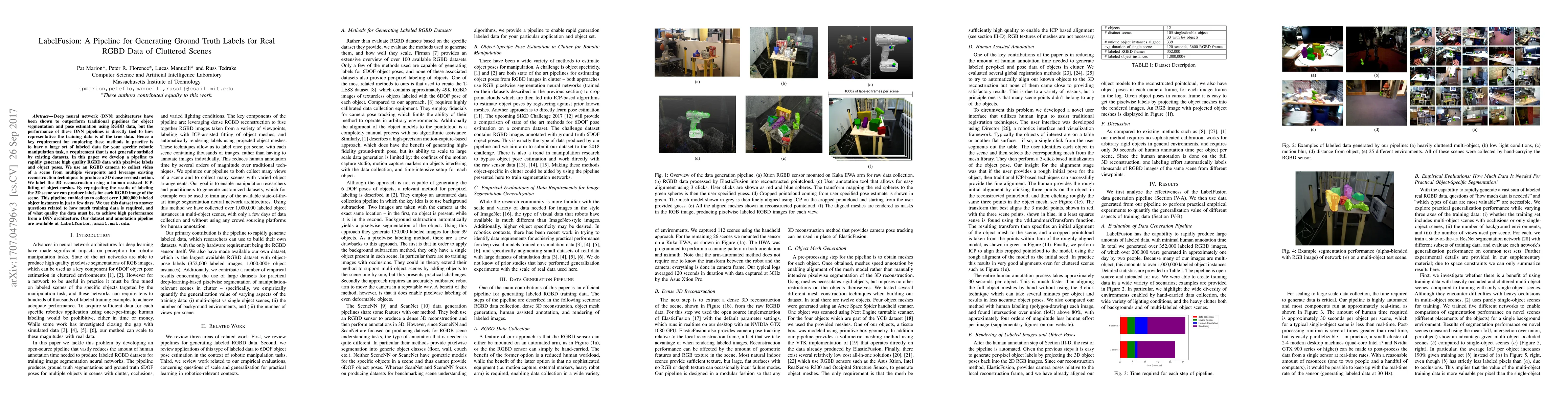 Deep neural network (DNN) architectures have been shown to outperform traditional pipelines for object segmentation and pose estimation using RGBD data, but the performance of these DNN pipelines is directly tied to how representative the training data is of the true data. Hence a key requirement for employing these methods in practice is to have a large set of labeled data for your specific robotic manipulation task, a requirement that is not generally satisfied by existing datasets. In this paper we develop a pipeline to rapidly generate high quality RGBD data with pixelwise labels and object poses. We use an RGBD camera to collect video of a scene from multiple viewpoints and leverage existing reconstruction techniques to produce a 3D dense reconstruction. We label the 3D reconstruction using a human assisted ICP-fitting of object meshes. By reprojecting the results of labeling the 3D scene we can produce labels for each RGBD image of the scene. This pipeline enabled us to collect over 1,000,000 labeled object instances in just a few days. We use this dataset to answer questions related to how much training data is required, and of what quality the data must be, to achieve high performance from a DNN architecture.