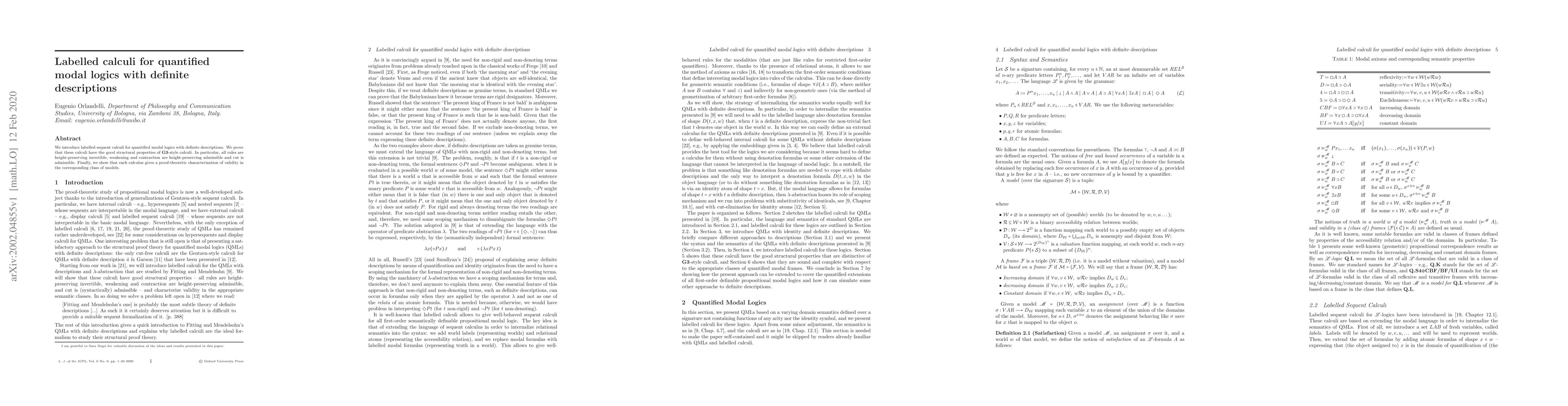 This paper presents labelled sequent calculi for quantified modal logics incorporating definite descriptions, demonstrating their structural properties akin to G3-style calculi and providing a proof-theoretic characterization of validity for the respective model classes.