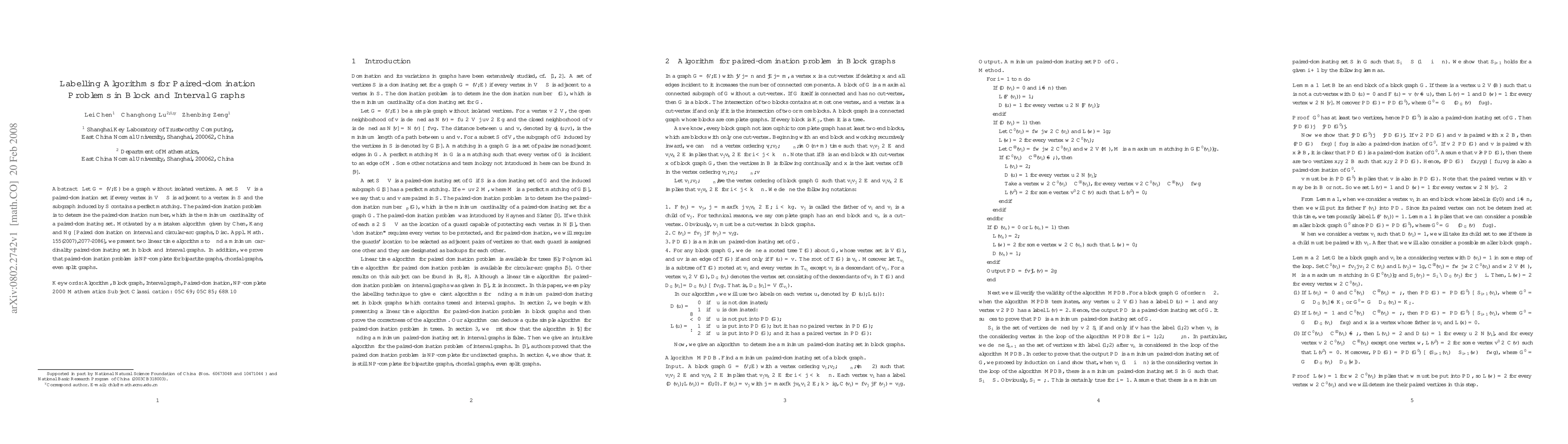 This paper presents linear time algorithms for determining the paired-domination number in block and interval graphs, correcting a previous erroneous algorithm. It also proves that the paired-domination problem is NP-complete for bipartite, chordal, and even split graphs.