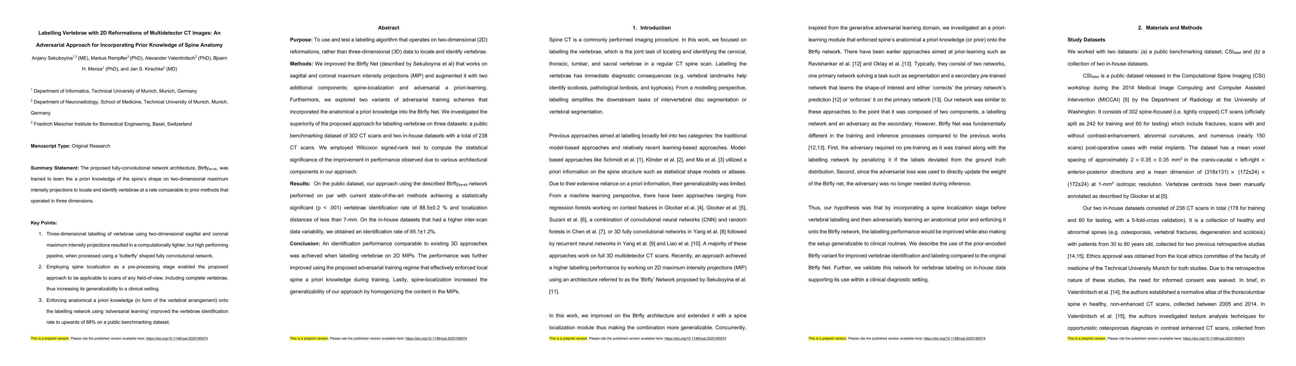 Purpose: To use and test a labelling algorithm that operates on two-dimensional (2D) reformations, rather than three-dimensional (3D) data to locate and identify vertebrae. Methods: We improved the Btrfly Net (described by Sekuboyina et al) that works on sagittal and coronal maximum intensity projections (MIP) and augmented it with two additional components: spine-localization and adversarial a priori-learning. Furthermore, we explored two variants of adversarial training schemes that incorporated the anatomical a priori knowledge into the Btrfly Net. We investigated the superiority of the proposed approach for labelling vertebrae on three datasets: a public benchmarking dataset of 302 CT scans and two in-house datasets with a total of 238 CT scans. We employed Wilcoxon signed-rank test to compute the statistical significance of the improvement in performance observed due to various architectural components in our approach. Results: On the public dataset, our approach using the described Btrfly(pe-eb) network performed on par with current state-of-the-art methods achieving a statistically significant (p < .001) vertebrae identification rate of 88.5+/-0.2 % and localization distances of less than 7-mm. On the in-house datasets that had a higher inter-scan data variability, we obtained an identification rate of 85.1+/-1.2%. Conclusion: An identification performance comparable to existing 3D approaches was achieved when labelling vertebrae on 2D MIPs. The performance was further improved using the proposed adversarial training regime that effectively enforced local spine a priori knowledge during training. Lastly, spine-localization increased the generalizability of our approach by homogenizing the content in the MIPs.