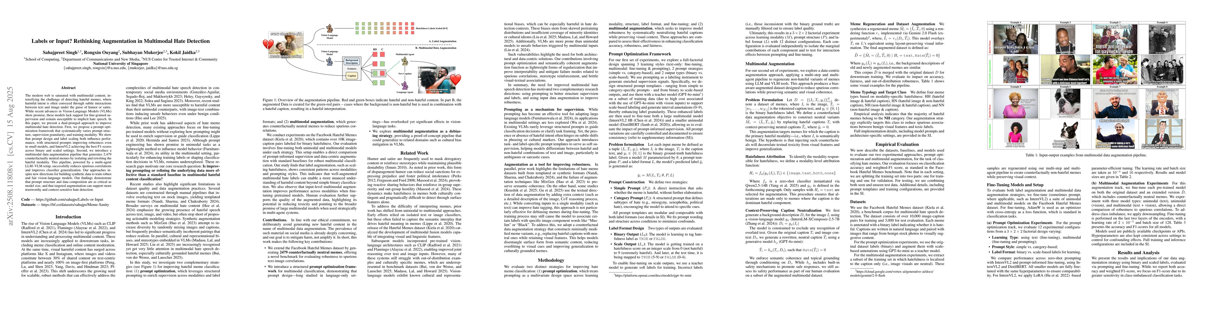 The modern web is saturated with multimodal content, intensifying the challenge of detecting hateful memes, where harmful intent is often conveyed through subtle interactions between text and image under the guise of humor or satire. While recent advances in Vision-Language Models (VLMs) show promise, these models lack support for fine-grained supervision and remain susceptible to implicit hate speech. In this paper, we present a dual-pronged approach to improve multimodal hate detection. First, we propose a prompt optimization framework that systematically varies prompt structure, supervision granularity, and training modality. We show that prompt design and label scaling both influence performance, with structured prompts improving robustness even in small models, and InternVL2 achieving the best F1-scores across binary and scaled settings. Second, we introduce a multimodal data augmentation pipeline that generates 2,479 counterfactually neutral memes by isolating and rewriting the hateful modality. This pipeline, powered by a multi-agent LLM-VLM setup, successfully reduces spurious correlations and improves classifier generalization. Our approaches inspire new directions for building synthetic data to train robust and fair vision-language models. Our findings demonstrate that prompt structure and data composition are as critical as model size, and that targeted augmentation can support more trustworthy and context-sensitive hate detection.