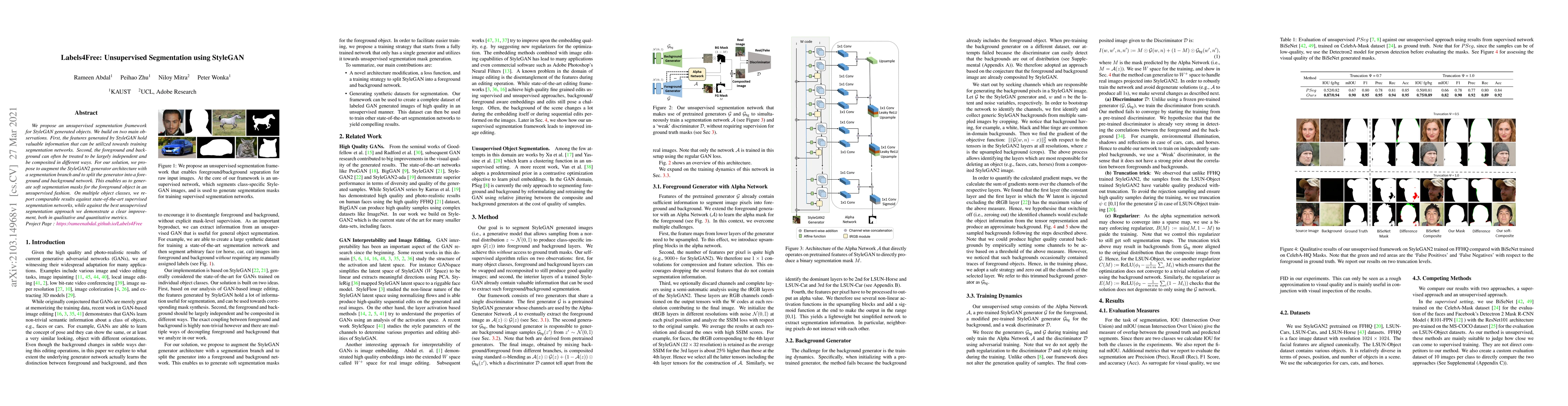 Labels4Free introduces an unsupervised segmentation framework for StyleGAN-generated objects, leveraging StyleGAN's features to train segmentation networks. The proposed method splits the generator into foreground and background networks, generating soft segmentation masks without labeled data, achieving competitive results against supervised and other unsupervised methods.