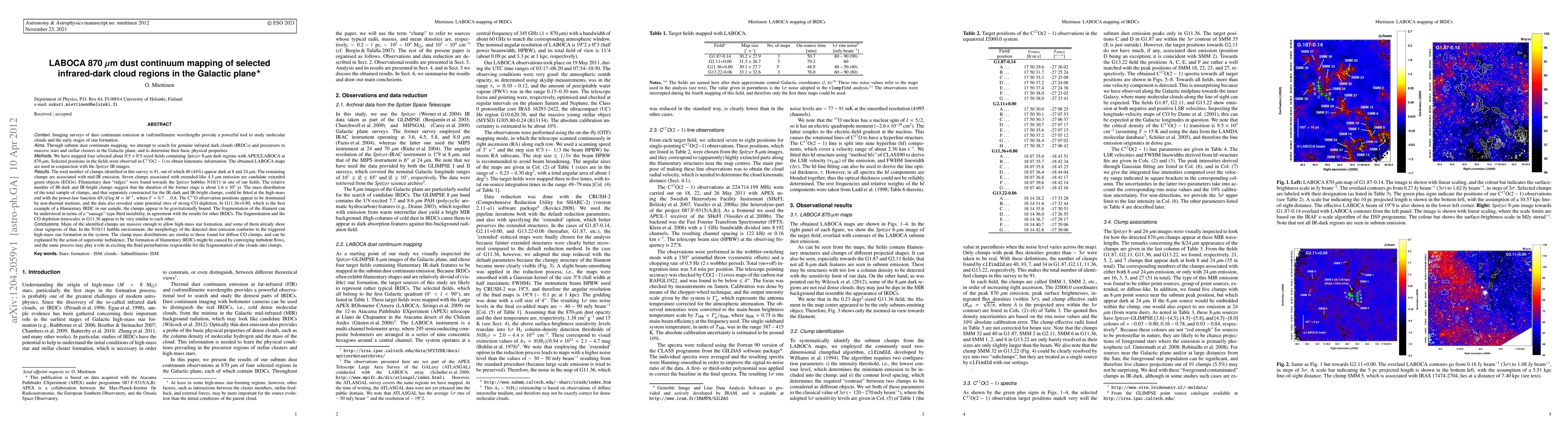 We have mapped four selected about 0.5 deg x 0.5 deg-sized fields containing Spitzer 8-micron dark regions with APEX/LABOCA at 870 micron. Selected positions in the fields were observed in C17O(2-1) to obtain kinematic information. The obtained LABOCA maps are used in conjunction with the Spitzer IR images. The total number of clumps identified in this survey is 91, out of which 40 (44%) appear dark at 8 and 24 micron. The remaining clumps are associated with mid-IR emission. Many of the identified clumps are massive enough to allow high-mass star formation, and some of them already show clear signposts of that. Seven clumps associated with extended-like 4.5 micron emission are candidate extended green objects (EGOs). Filamentary dust "ridges" were found towards the Spitzer bubbles N10/11 in one of our fields, which conforms to the triggered high-mass star formation in the system. The relative number of IR-dark and IR-bright clumps suggest that the duration of the former stage is about 1.6x10^5 yr. The mass distribution of the total sample of clumps, and that separately constructed for the IR-dark and IR-bright clumps, could be fitted at the high-mass end with the power-law function dN/dlogM ~ M^(-0.8...-0.7). The C17O observation positions appear to be dominated by non-thermal motions, and the data also revealed some potential sites of strong CO depletion. In G11.36+0.80, which is the best example of a filamentary IRDC in our sample, the clumps appear to be gravitationally bound. The fragmentation of the filament can be understood in terms of a "sausage"-type fluid instability, in agreement with the results for other IRDCs. The formation of filamentary IRDCs might be caused by converging turbulent flows, and the same process may play a role in exciting the fluid perturbations responsible for the fragmentation of the clouds into clumps.