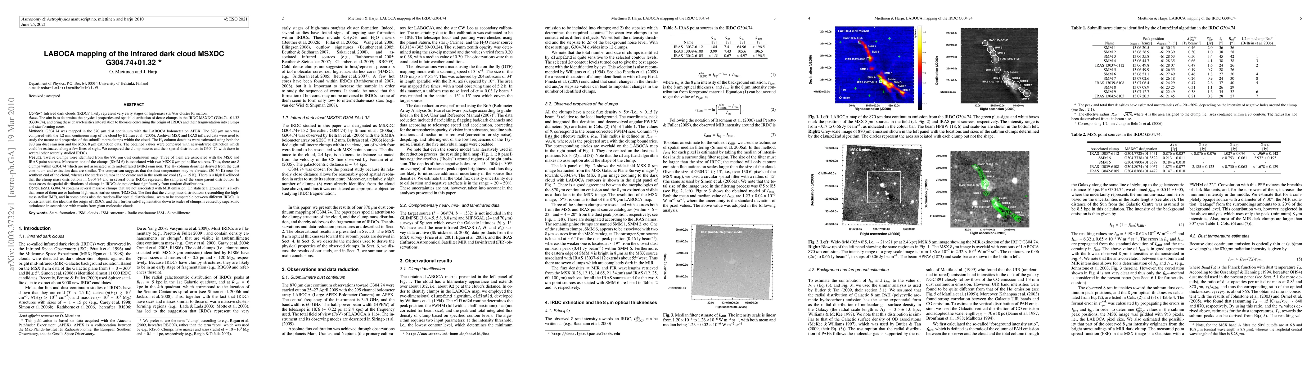 Infrared dark clouds (IRDCs) likely represent very early stages of high-mass star/star cluster formation. In this study, we aim to determine the physical properties and spatial distribution of dense clumps in the IRDC MSXDC G304.74+01.32 (G304.74), and bring these characteristics into relation to theories concerning the origin of IRDCs and their fragmentation into clumps and star-forming cores. G304.74 was mapped in the 870 $\mu$m dust continuum with the LABOCA bolometer on APEX. Archival MSX and IRAS infrared data were used to study the nature and properties of the submillimetre clumps within the cloud. There are 8 clumps within G304.74 which are not associated with mid-infrared (MIR) emission. Some of them are candidates for being/harbouring high-mass starless cores (HMSCs). We compared the clump masses and their spatial distribution in G304.74 with those in several other recently studied IRDCs. There is a high likelihood that the clump mass distributions in G304.74 and in several other IRDCs represent the samples of the same parent distribution. In most cases the spatial distributions of clumps in IRDCs do not deviate significantly from random distributions. This is consistent with the idea that the origin of IRDCs, and their further sub-fragmentation down to scales of clumps is caused by supersonic turbulence in accordance with results from giant molecular clouds.