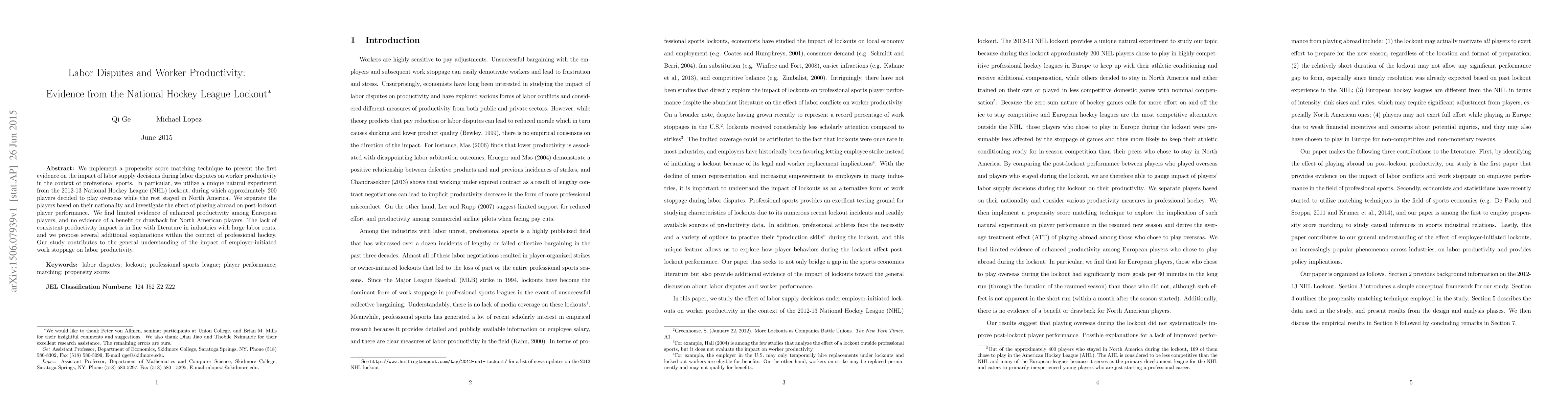 This study uses propensity score matching to analyze the effect of labor disputes on worker productivity in professional sports, focusing on NHL players during the 2012-13 lockout. It finds limited productivity enhancement for European players who played abroad but no significant impact for North American players.