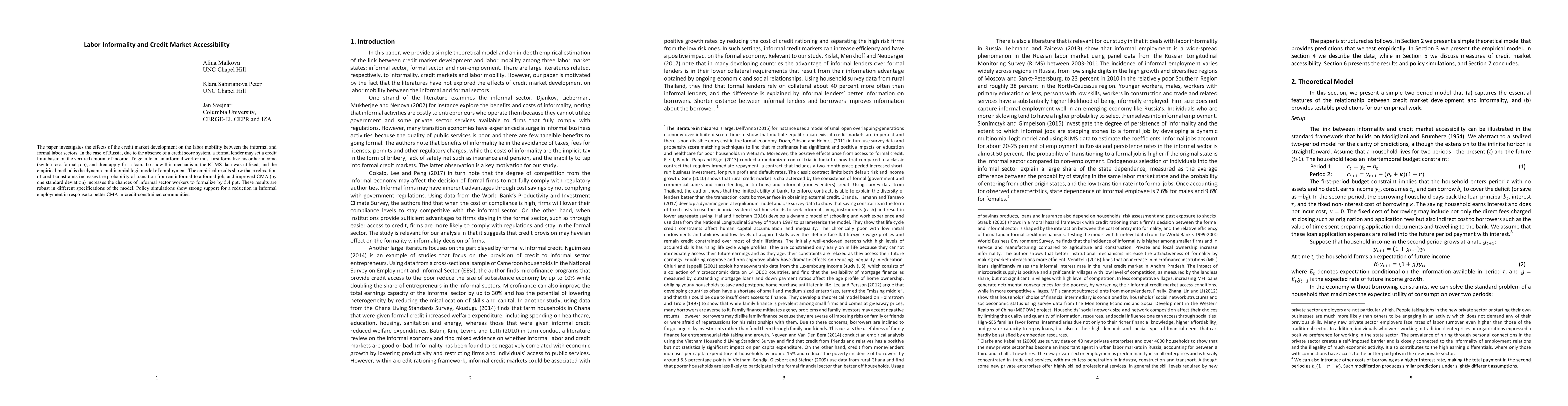 The paper investigates the effects of the credit market development on the labor mobility between the informal and formal labor sectors. In the case of Russia, due to the absence of a credit score system, a formal lender may set a credit limit based on the verified amount of income. To get a loan, an informal worker must first formalize his or her income (switch to a formal job), and then apply for a loan. To show this mechanism, the RLMS data was utilized, and the empirical method is the dynamic multinomial logit model of employment. The empirical results show that a relaxation of credit constraints increases the probability of transition from an informal to a formal job, and improved CMA (by one standard deviation) increases the chances of informal sector workers to formalize by 5.4 ppt. These results are robust in different specifications of the model. Policy simulations show strong support for a reduction in informal employment in response to better CMA in credit-constrained communities.