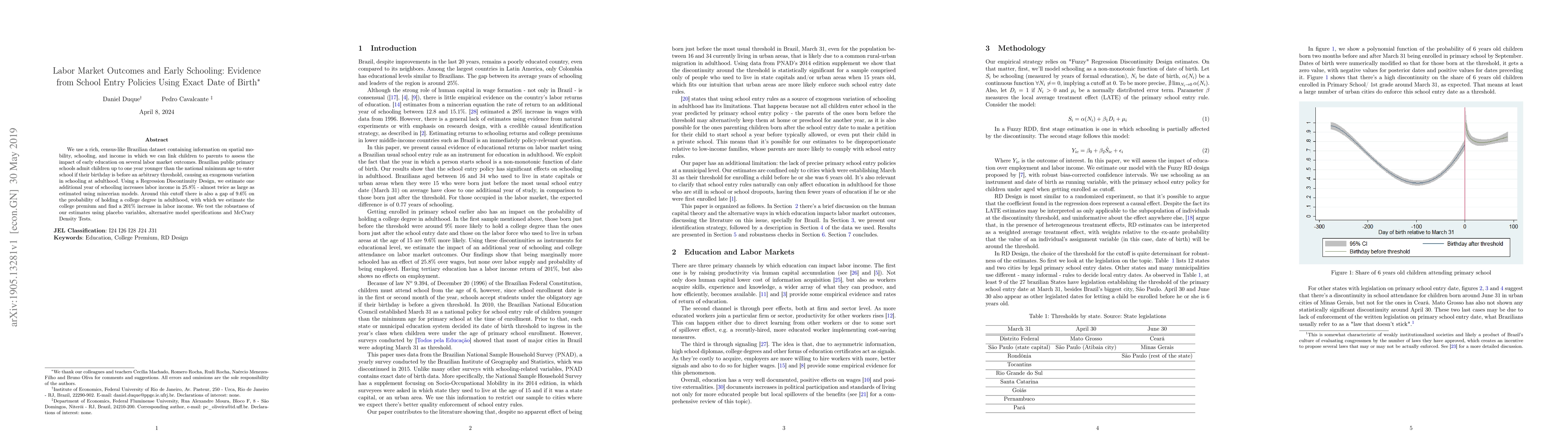 This study uses Brazilian data to examine the impact of early schooling on adult labor market outcomes, finding that one additional year of schooling increases labor income by 25.8%. The study also reveals a significant 9.6% gap in college degree attainment near the school entry cutoff, correlating with a 201% increase in labor income for college graduates.