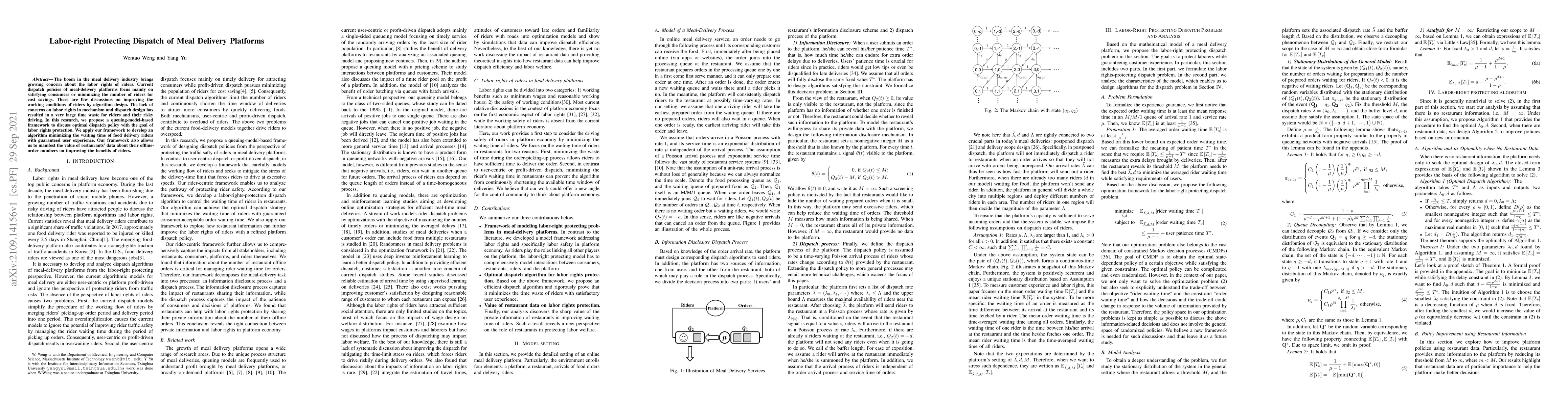 This research proposes a queuing-model-based framework to optimize dispatch policies for meal delivery platforms, aiming to protect the labor rights of riders by minimizing their waiting time and improving their working conditions. The developed algorithm ensures a balance between rider benefits and user experience, leveraging restaurant data to enhance rider efficiency.