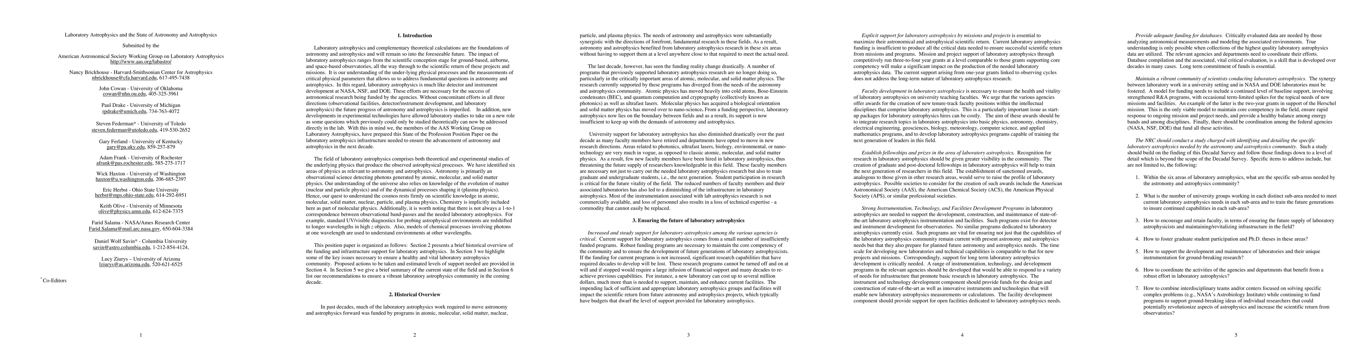 Laboratory astrophysics and complementary theoretical calculations are the foundations of astronomy and astrophysics and will remain so into the foreseeable future. The impact of laboratory astrophysics ranges from the scientific conception stage for ground-based, airborne, and space-based observatories, all the way through to the scientific return of these projects and missions. It is our understanding of the under-lying physical processes and the measurements of critical physical parameters that allows us to address fundamental questions in astronomy and astrophysics. In this regard, laboratory astrophysics is much like detector and instrument development at NASA, NSF, and DOE. These efforts are necessary for the success of astronomical research being funded by the agencies. Without concomitant efforts in all three directions (observational facilities, detector/instrument development, and laboratory astrophysics) the future progress of astronomy and astrophysics is imperiled. In addition, new developments in experimental technologies have allowed laboratory studies to take on a new role as some questions which previously could only be studied theoretically can now be addressed directly in the lab. With this in mind we, the members of the AAS Working Group on Laboratory Astrophysics, have prepared this State of the Profession Position Paper on the laboratory astrophysics infrastructure needed to ensure the advancement of astronomy and astrophysics in the next decade.