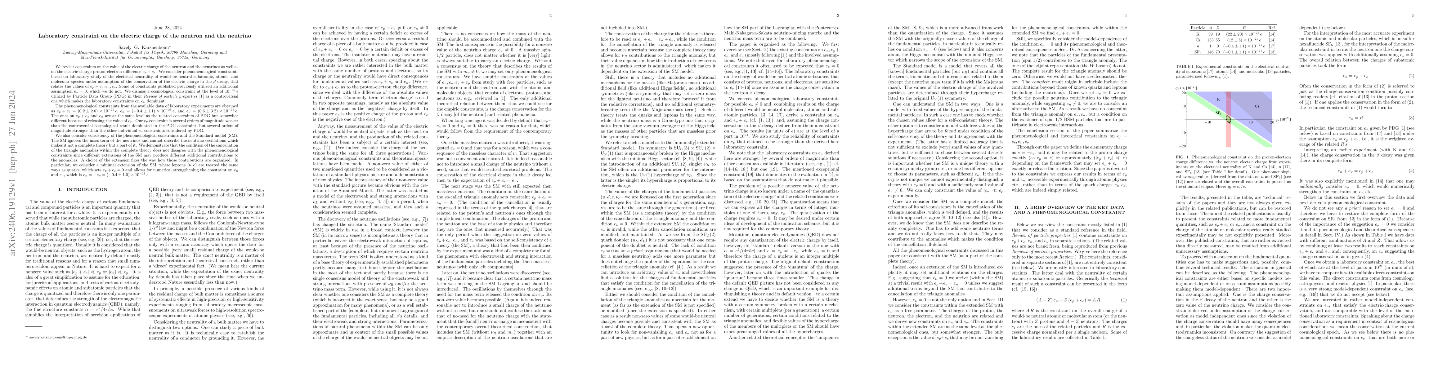 This research paper revisits laboratory-based constraints on the electric charge of the neutron, neutrino, and the sum of proton and electron charges. It presents new phenomenological constraints, notably e_nu=(0.6±3.2)×10^-21 e, significantly weaker than controversial cosmological constraints but stronger than other individual e_nu constraints, and supports the Standard Model despite its incomplete nature regarding neutrino oscillations.