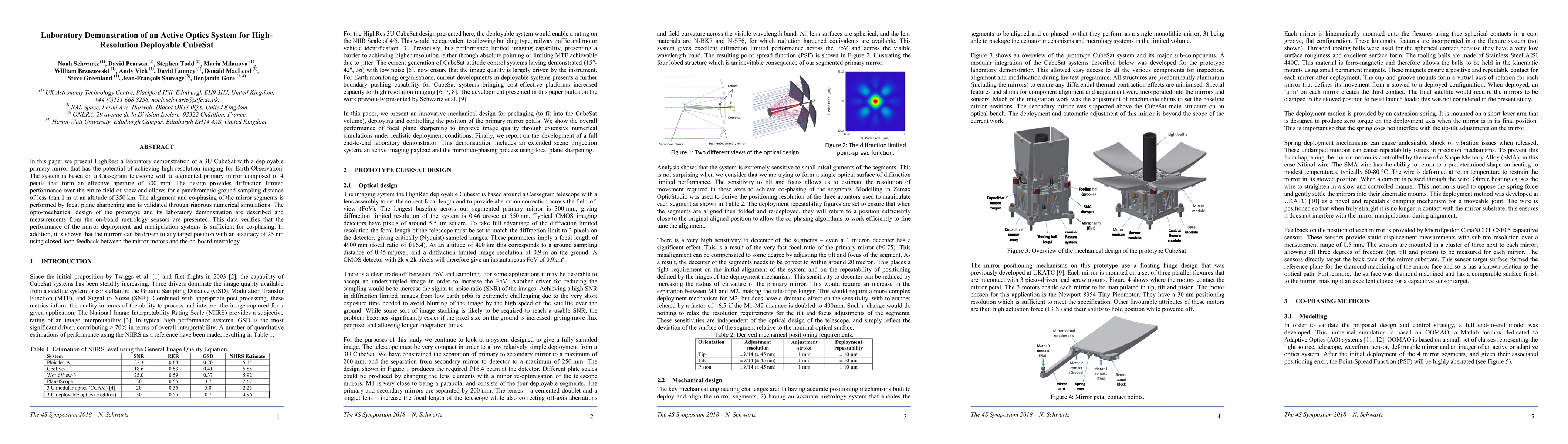 In this paper we present HighRes: a laboratory demonstration of a 3U CubeSat with a deployable primary mirror that has the potential of achieving high-resolution imaging for Earth Observation. The system is based on a Cassegrain telescope with a segmented primary mirror composed of 4 petals that form an effective aperture of 300 mm. The design provides diffraction limited performance over the entire field-of-view and allows for a panchromatic ground-sampling distance of less than 1 m at an altitude of 350 km. The alignment and co-phasing of the mirror segments is performed by focal plane sharpening and is validated through rigorous numerical simulations. The opto-mechanical design of the prototype and its laboratory demonstration are described and measurements from the on-board metrology sensors are presented. This data verifies that the performance of the mirror deployment and manipulation systems is sufficient for co-phasing. In addition, it is shown that the mirrors can be driven to any target position with an accuracy of 25 nm using closed-loop feedback between the mirror motors and the on-board metrology.