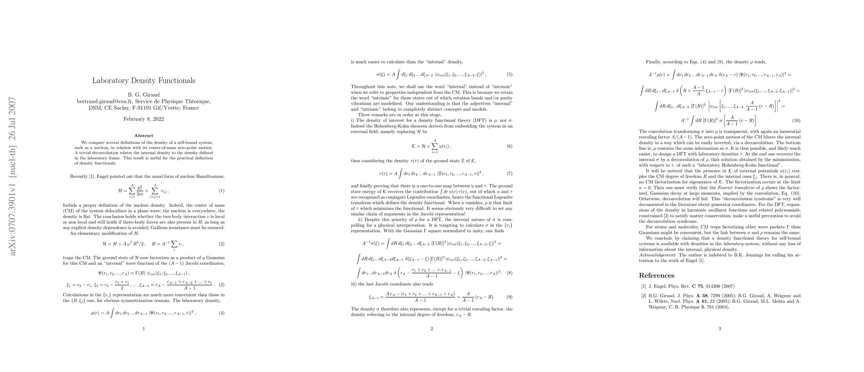 We compare several definitions of the density of a self-bound system, such as a nucleus, in relation with its center-of-mass zero-point motion. A trivial deconvolution relates the internal density to the density defined in the laboratory frame. This result is useful for the practical definition of density functionals.