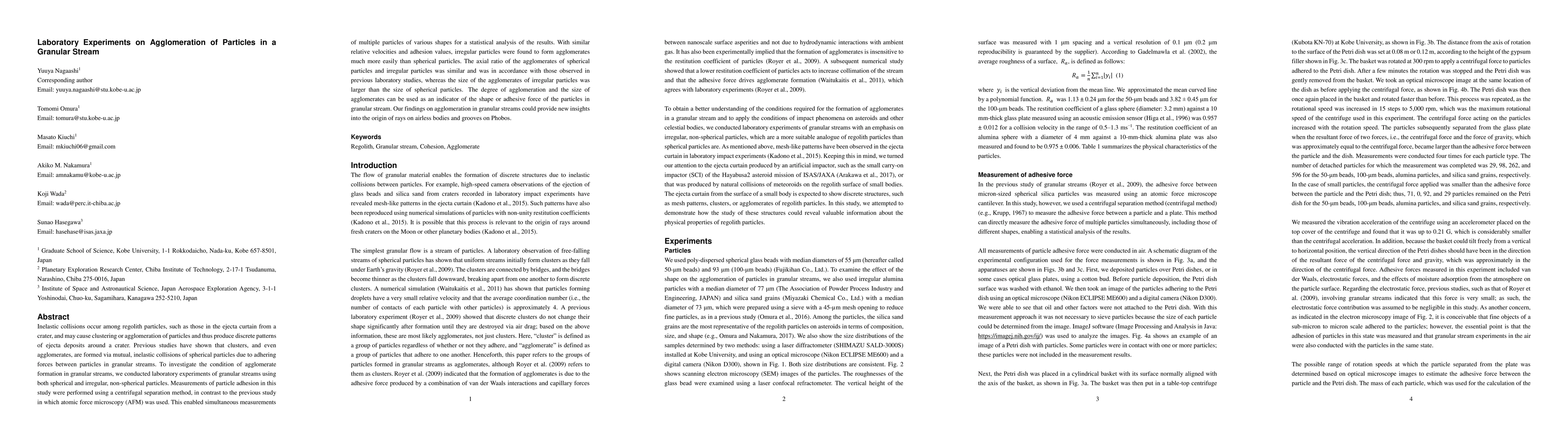 This study investigates the agglomeration of particles in granular streams through laboratory experiments using spherical and irregular particles. Irregular particles formed larger agglomerates more easily than spherical ones, indicating that particle shape significantly influences agglomeration, with implications for understanding ejecta patterns on airless bodies.